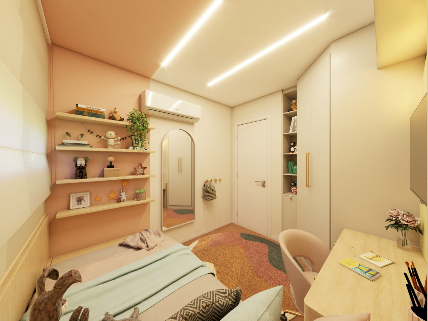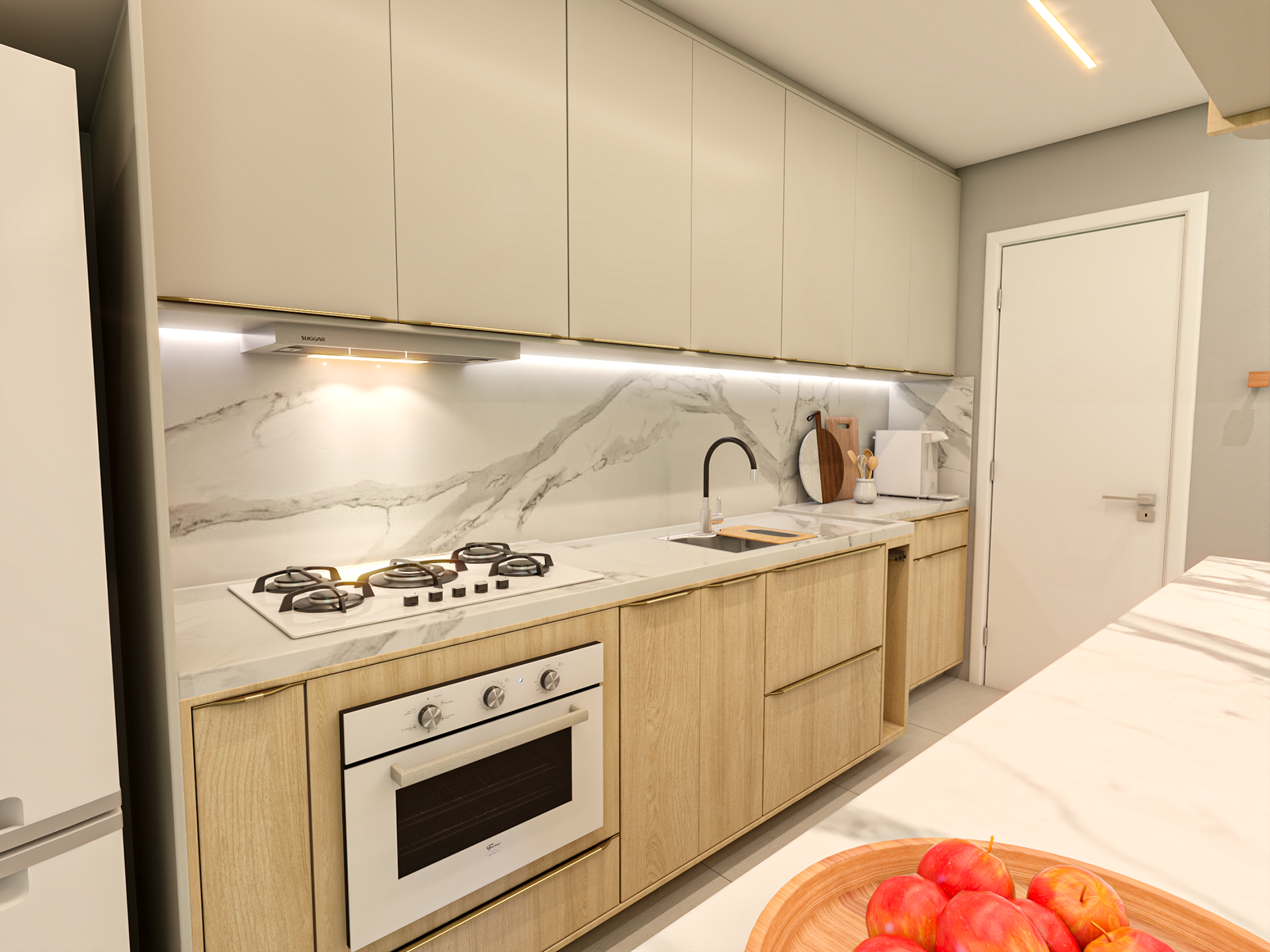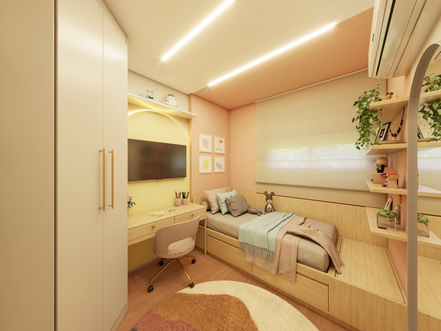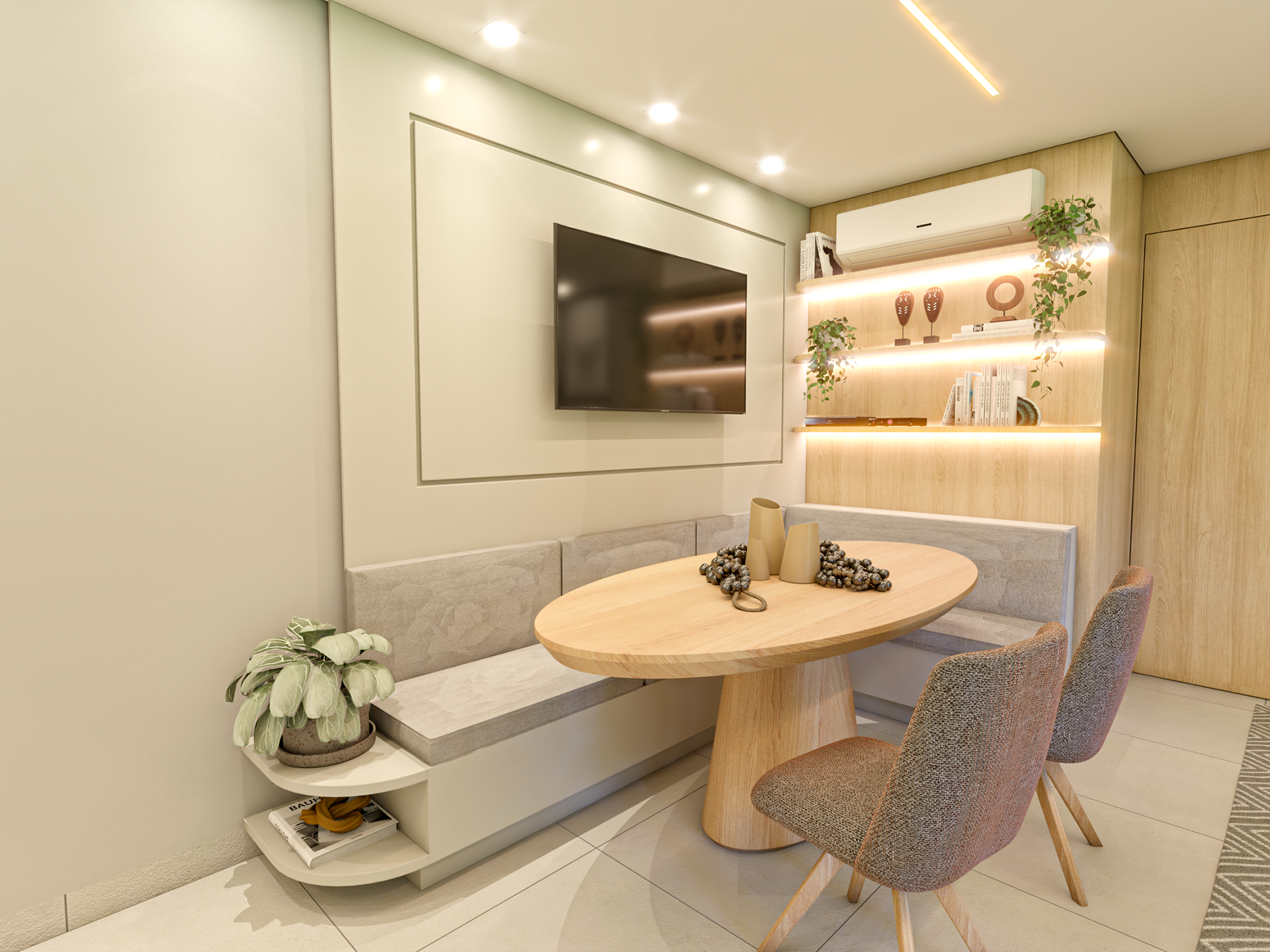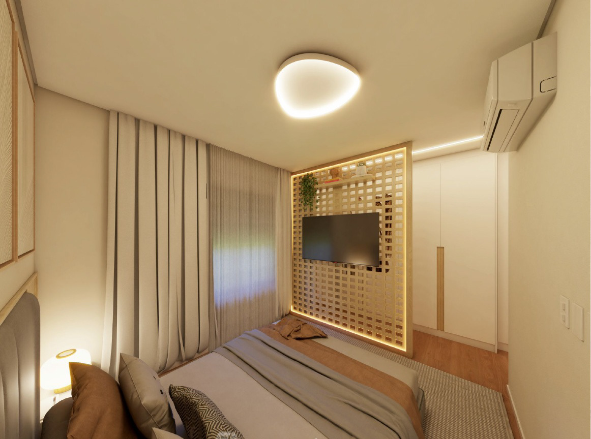 Apto 101 é um projeto completo pensado para uma família com dois filhos, onde a integração foi a grande protagonista. A cozinha se abre para a sala, com uma ilha que organiza os ambientes e facilita o dia a dia. A paleta é clara, com madeira clara e bancadas em lâmina ultracompacta, trazendo leveza e sensação de amplitude. Para aproveitar melhor o espaço e o sofá de 3 metros da família, transformamos o canto alemão em painel de TV, garantindo funcionalidade, conforto e um layout bem resolvido.