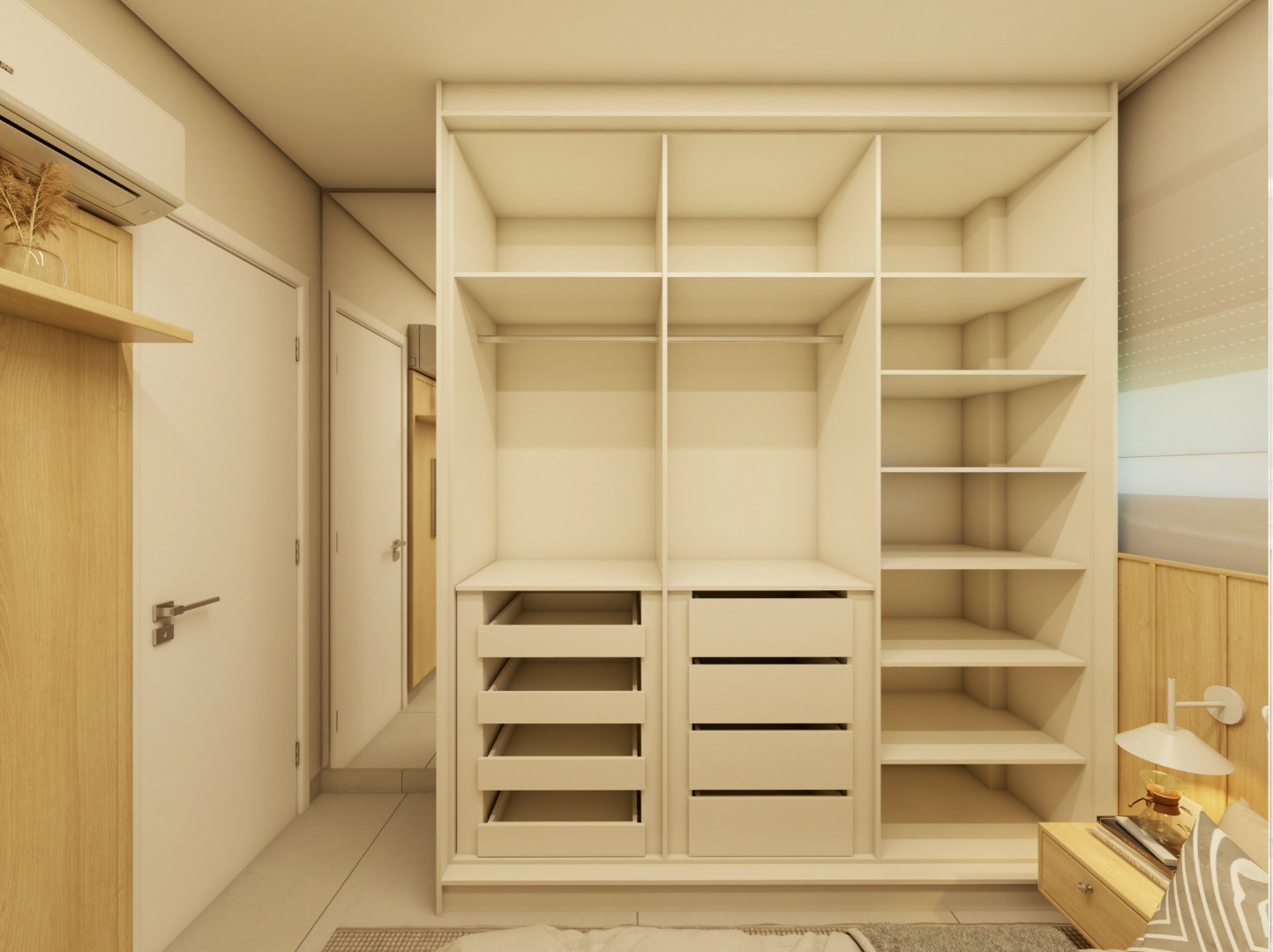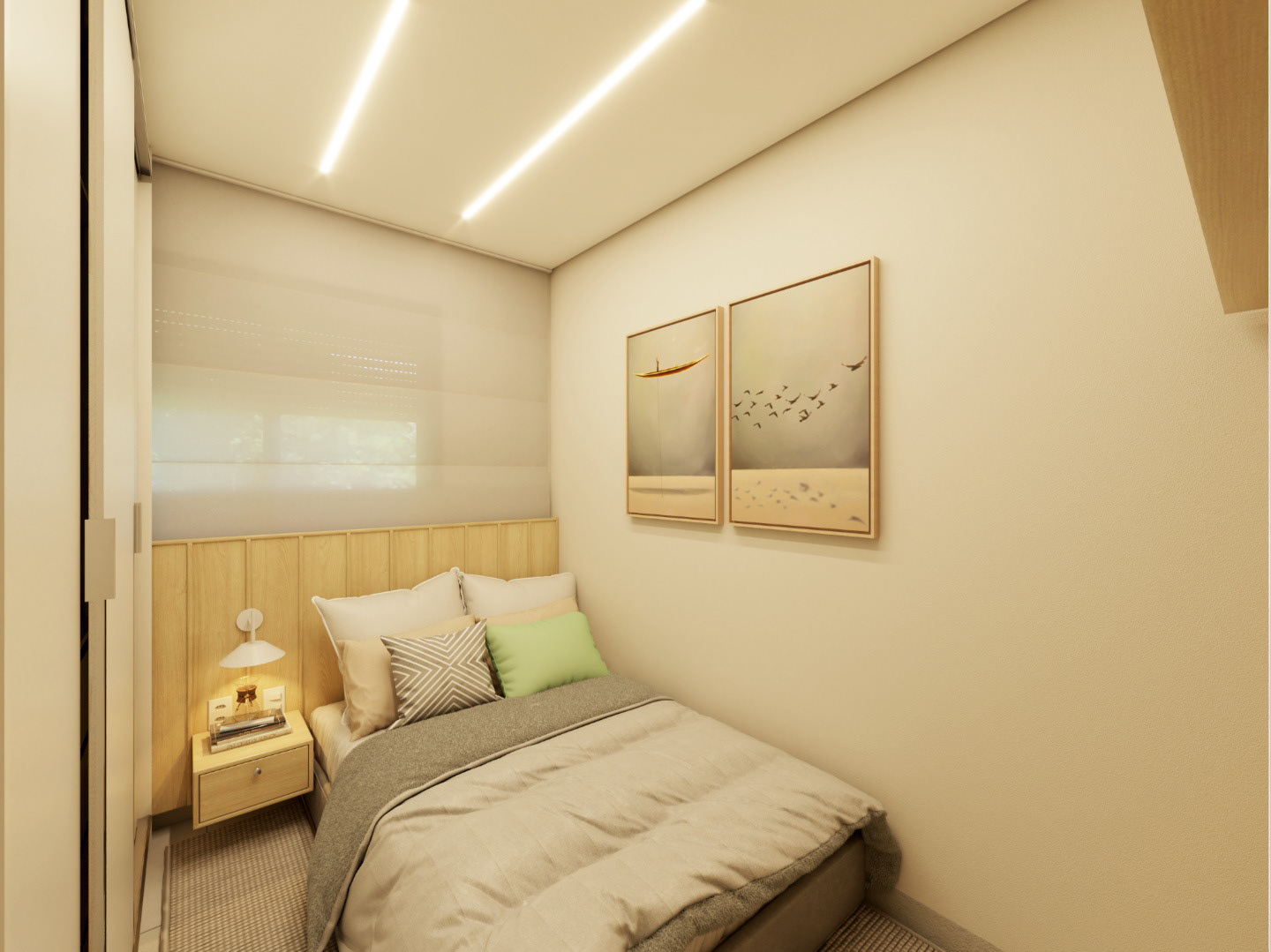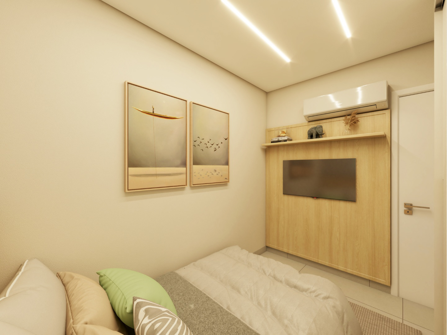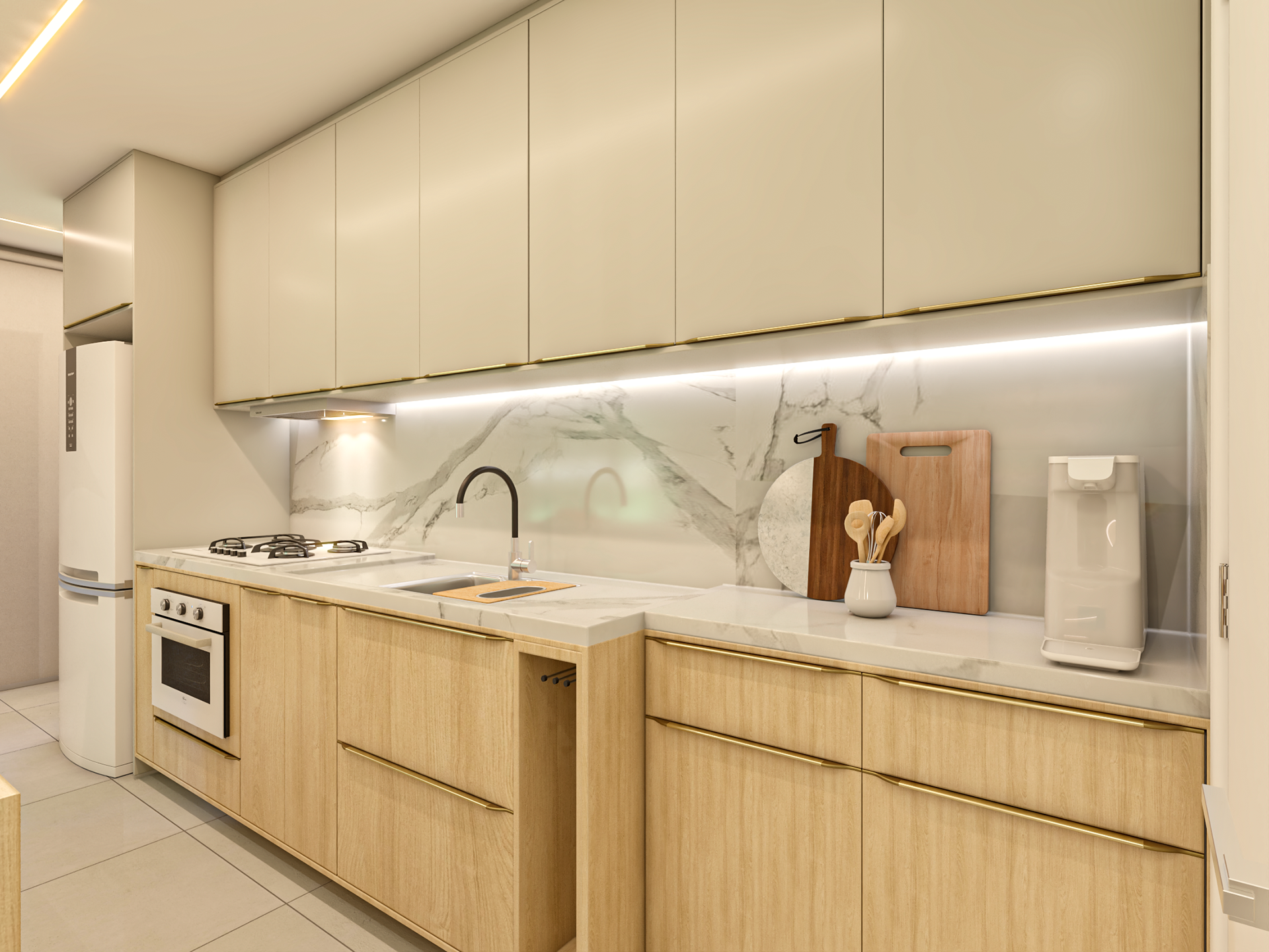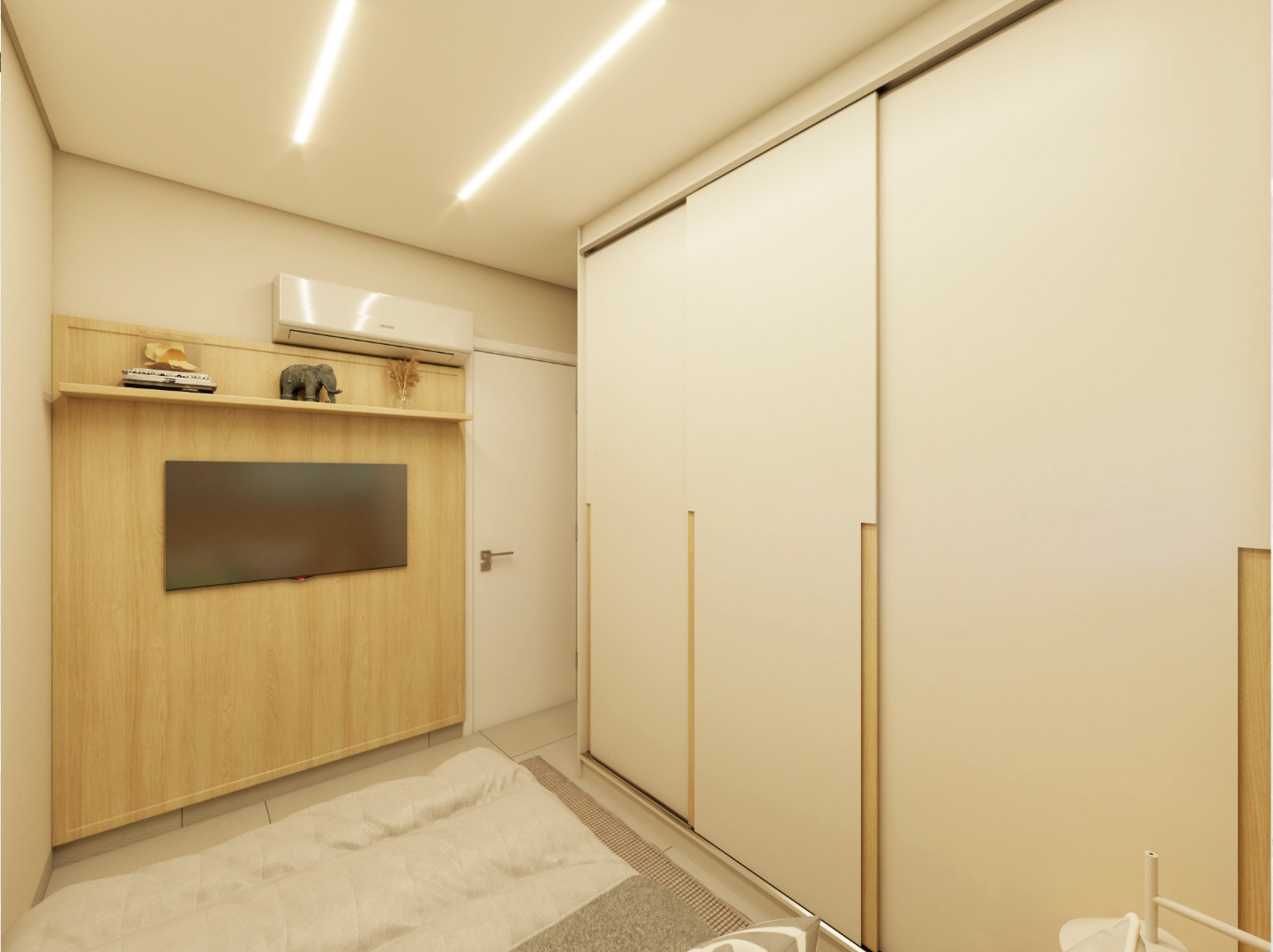 Apto 101 é um projeto completo pensado para uma família com dois filhos, onde a integração foi a grande protagonista. A cozinha se abre para a sala, com uma ilha que organiza os ambientes e facilita o dia a dia. A paleta é clara, com madeira clara e bancadas em lâmina ultracompacta, trazendo leveza e sensação de amplitude. Para aproveitar melhor o espaço e o sofá de 3 metros da família, transformamos o canto alemão em painel de TV, garantindo funcionalidade, conforto e um layout bem resolvido.