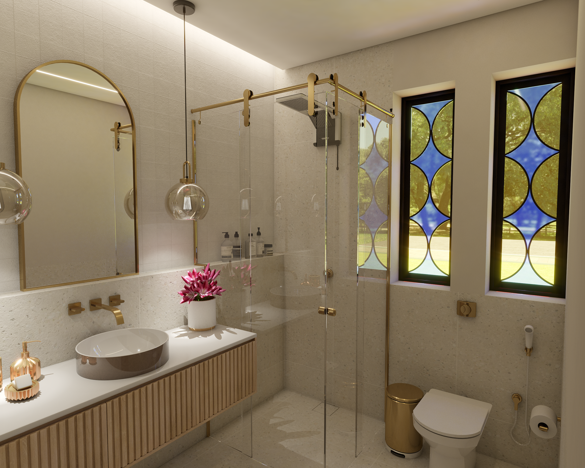 Na nova garagem, desenhamos um portão arqueado com vitrais, inspirado nas janelas originais da casa. Criamos também réplicas dessas janelas na lateral, garantindo ventilação e iluminação natural, além do telhado de barro em duas águas, preservando a estética original.