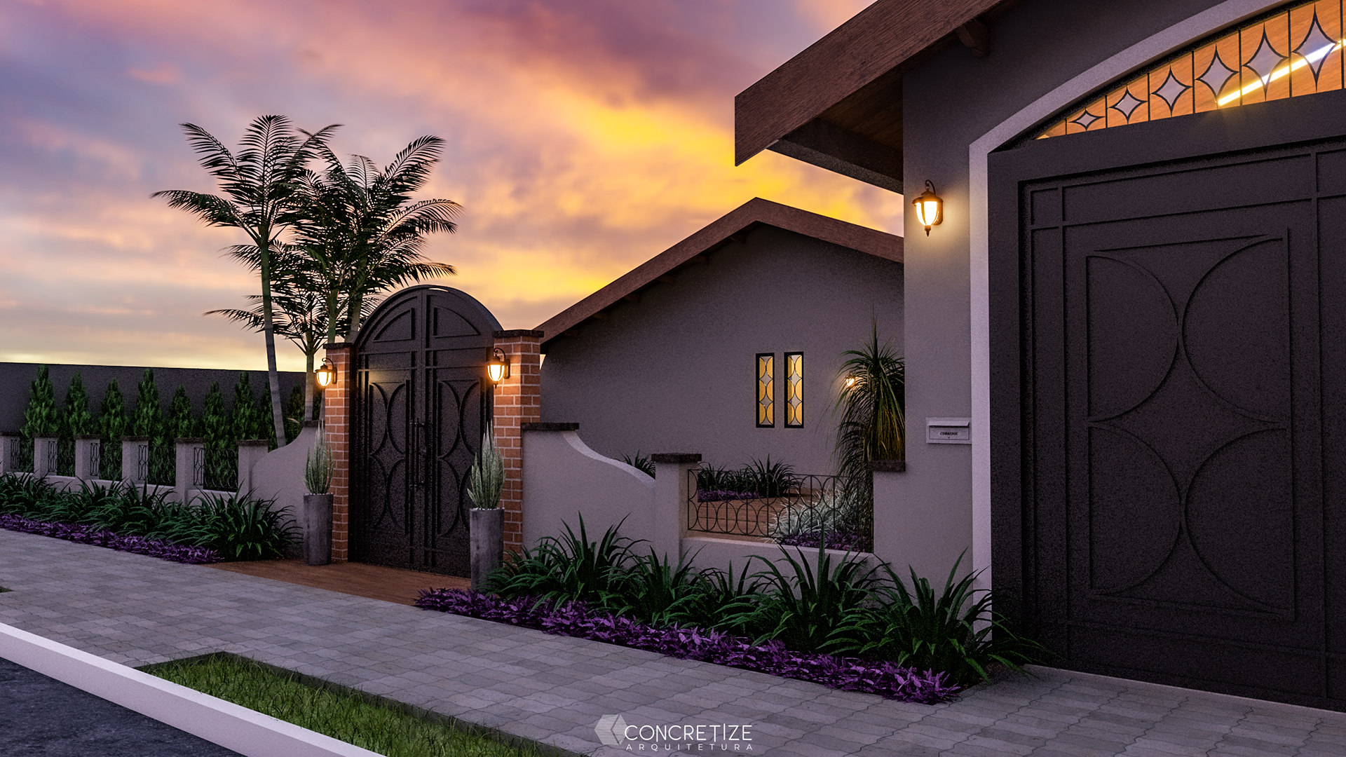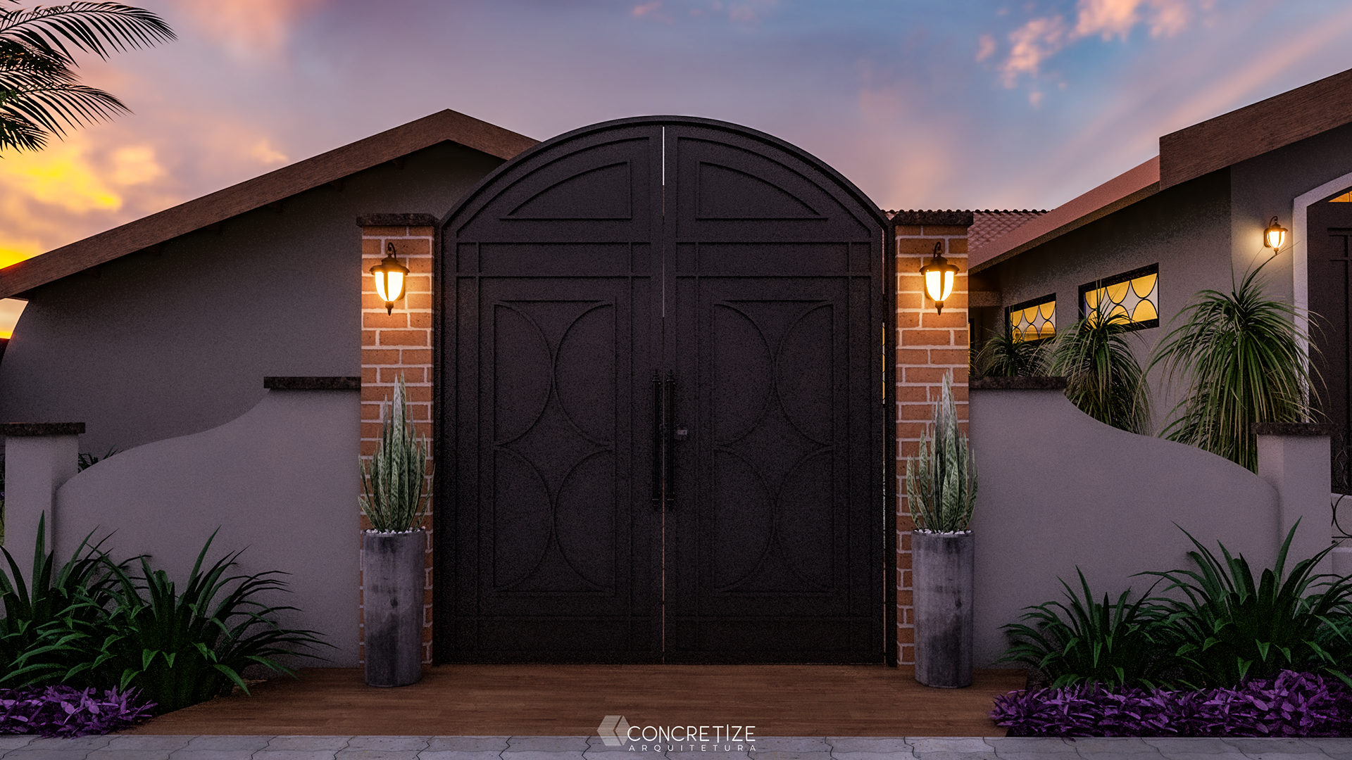 O grande destaque fica por conta do portão de pedestre: um conjunto delicado de mureta com pilares em tijolinho, portão em arco de duas folhas, molduras curvas, puxador detalhado e arandelas coloniais, tudo dialogando com os desenhos da fachada existente.