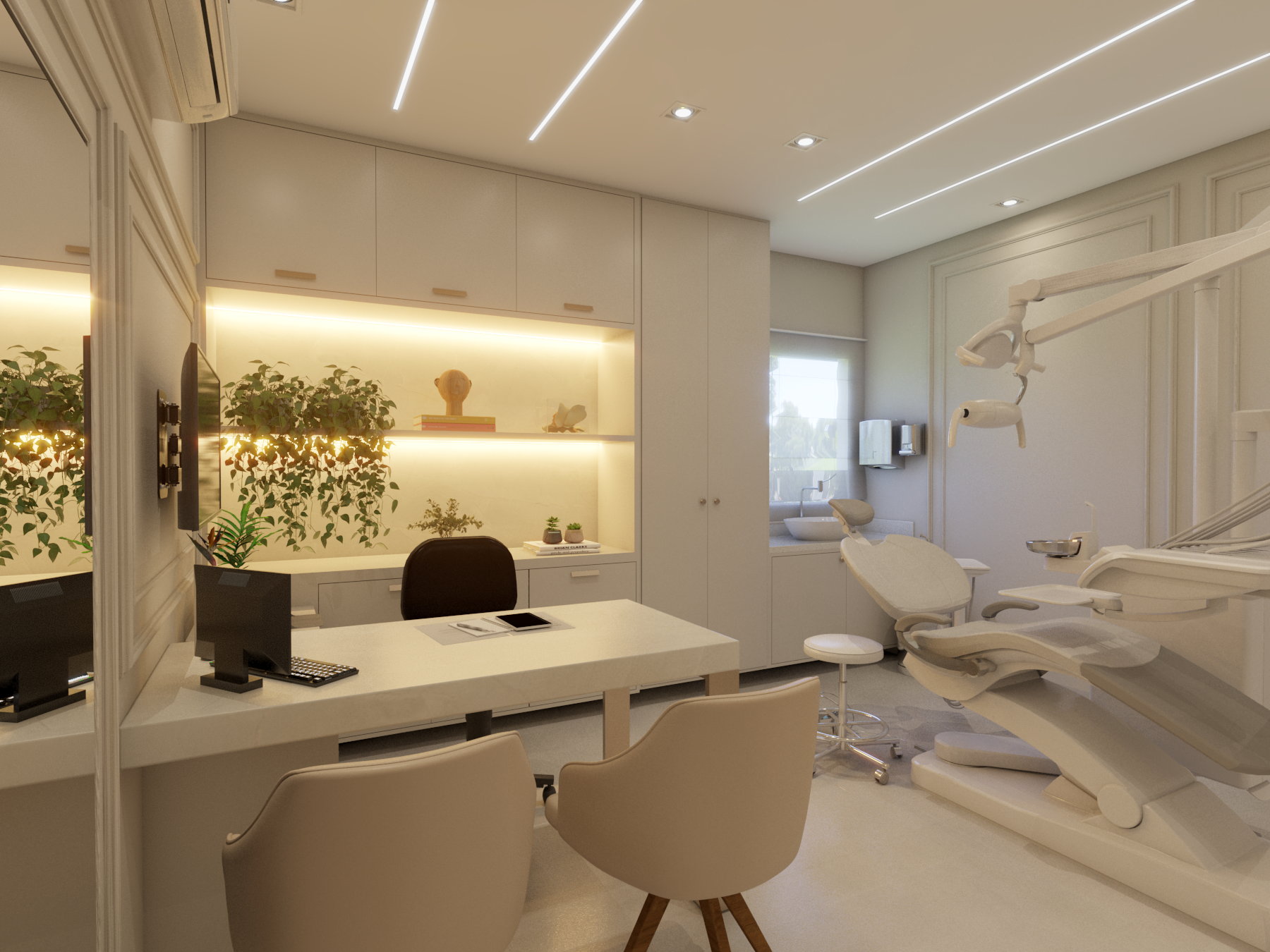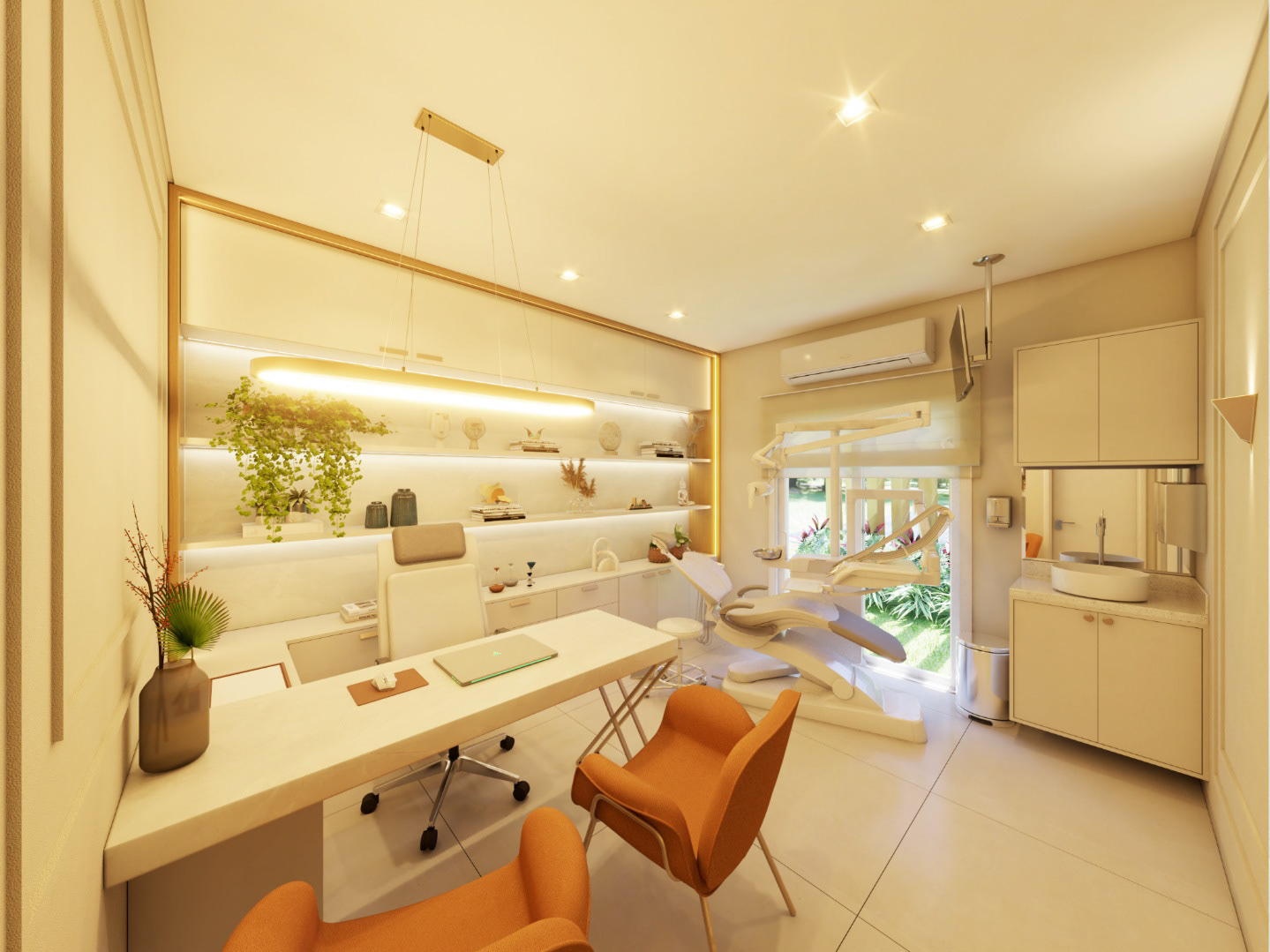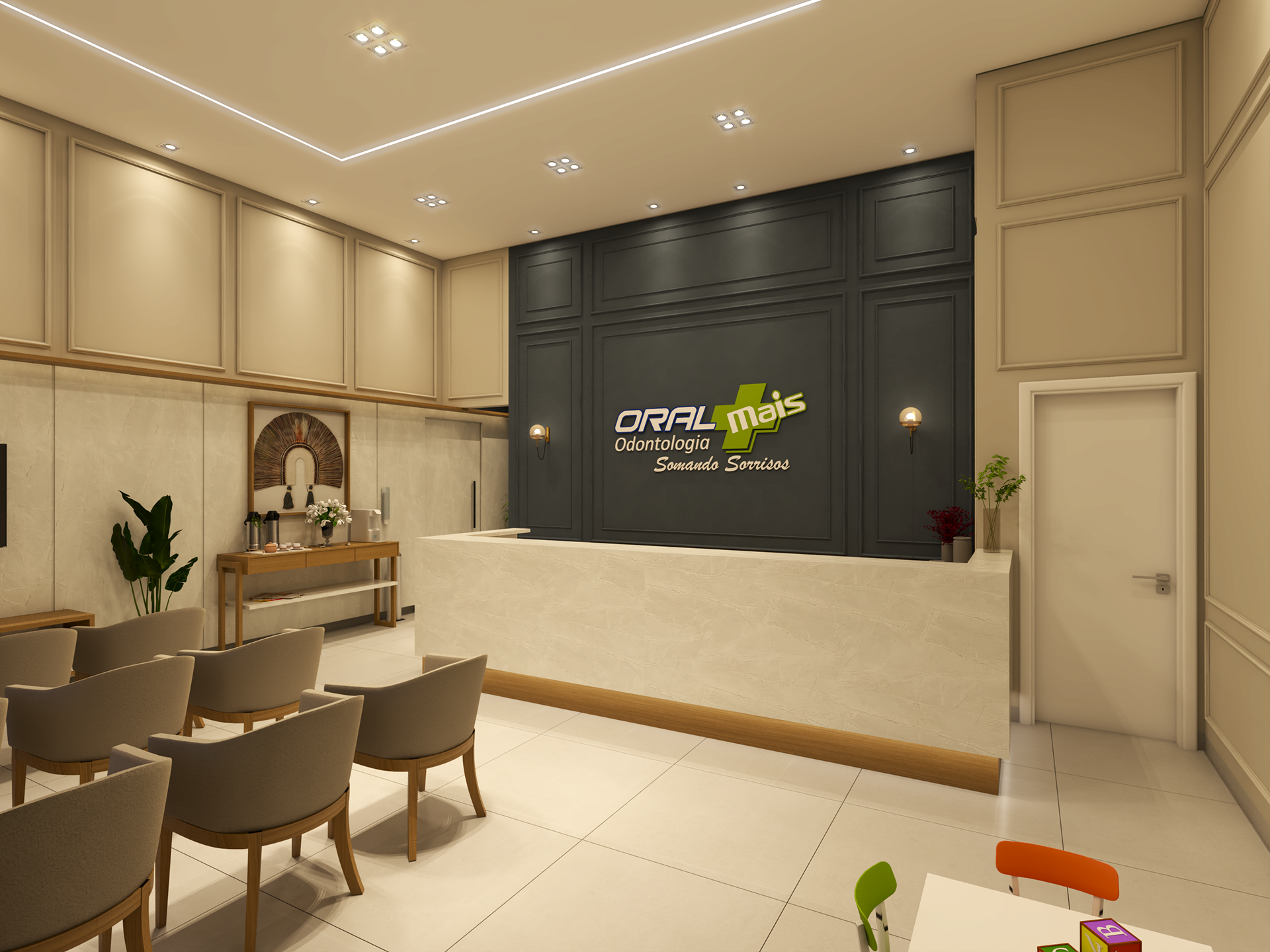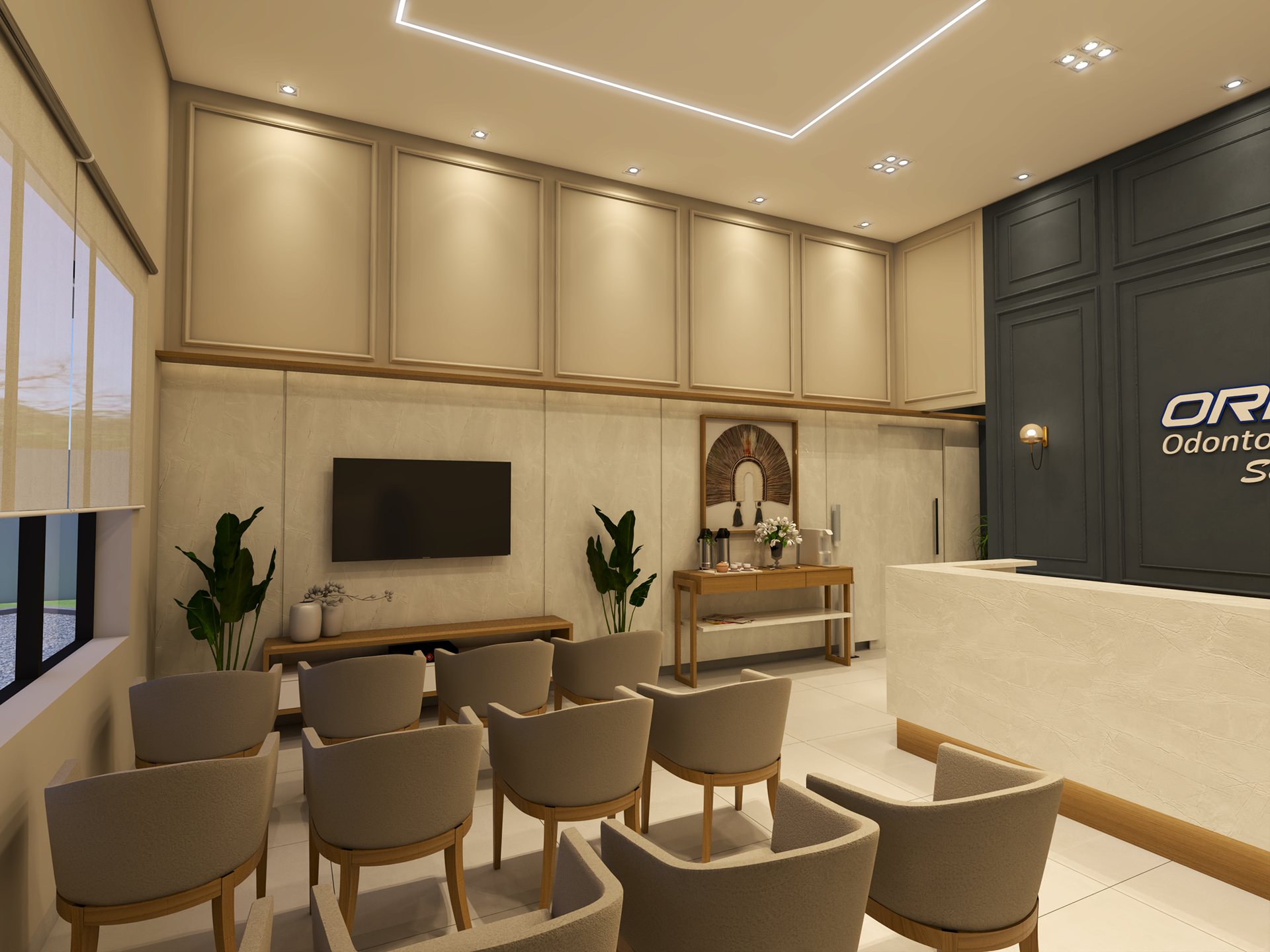 Uma reforma que vai além do layout: transformamos a experiência. Houve ajustes na estrutura interna das salas, mas o grande destaque ficou para a nova recepção e a fachada. Propusemos uma fachada mais marcante e sofisticada, usando azul marinho, branco e madeira — mantendo a identidade da marca, porém com um ar mais refinado. Na recepção, elevamos o pé-direito e usamos o azul escuro para valorizar o nome da clínica, equilibrando com tons neutros e mármores claros. Já nas salas, o foco foi criar ambientes mais agradáveis e alinhados a um público que busca um atendimento diferenciado, elegante e acolhedor.