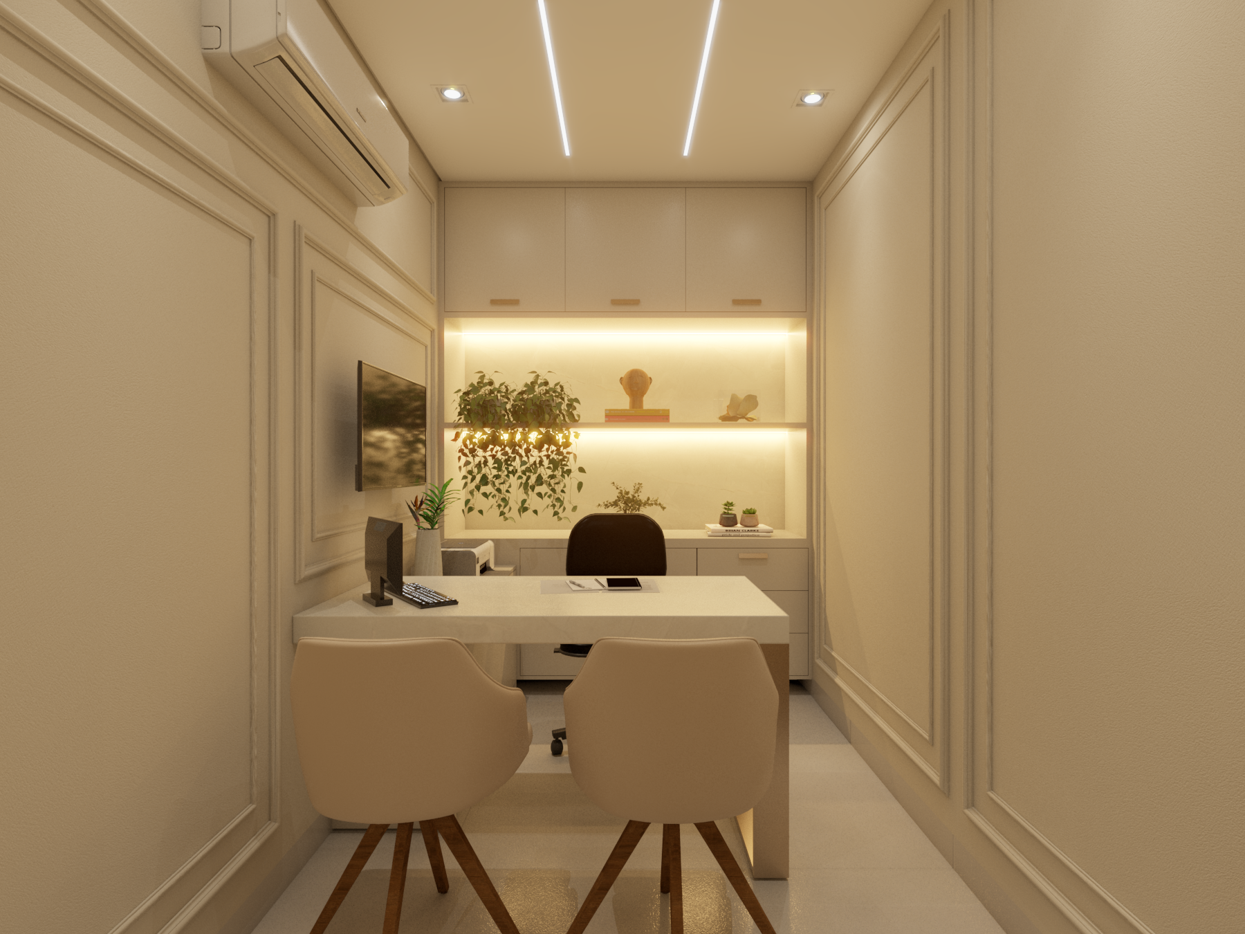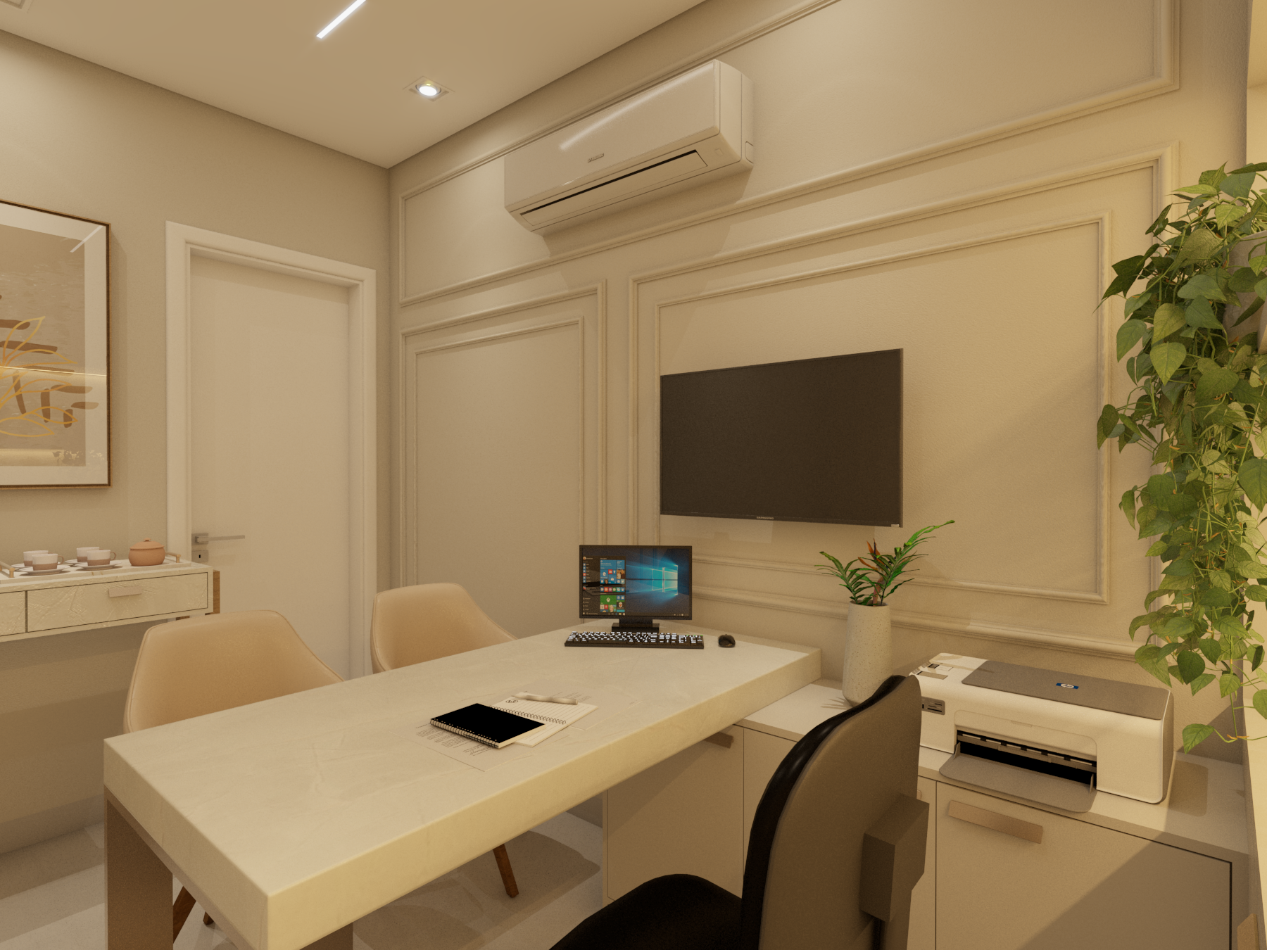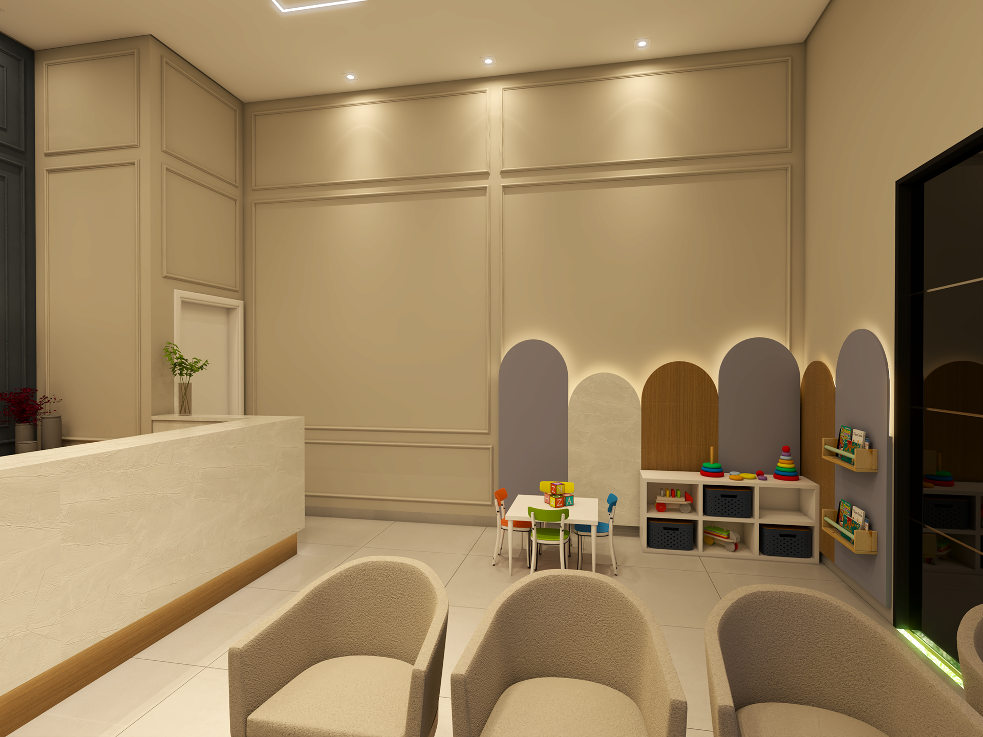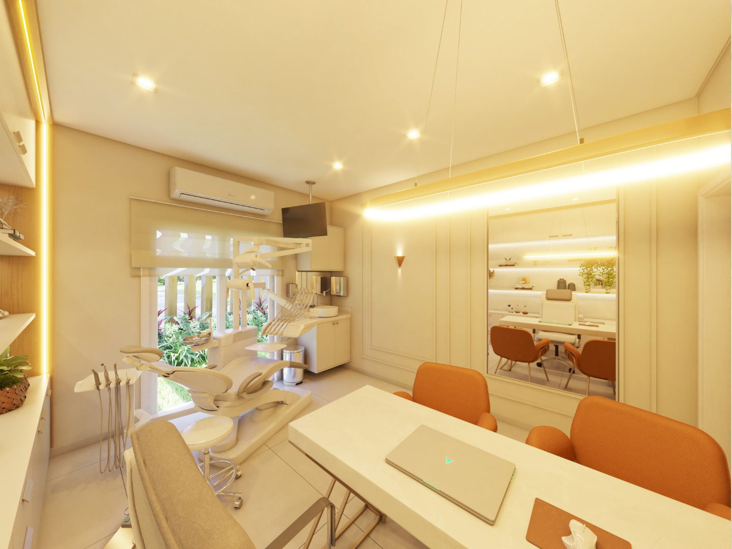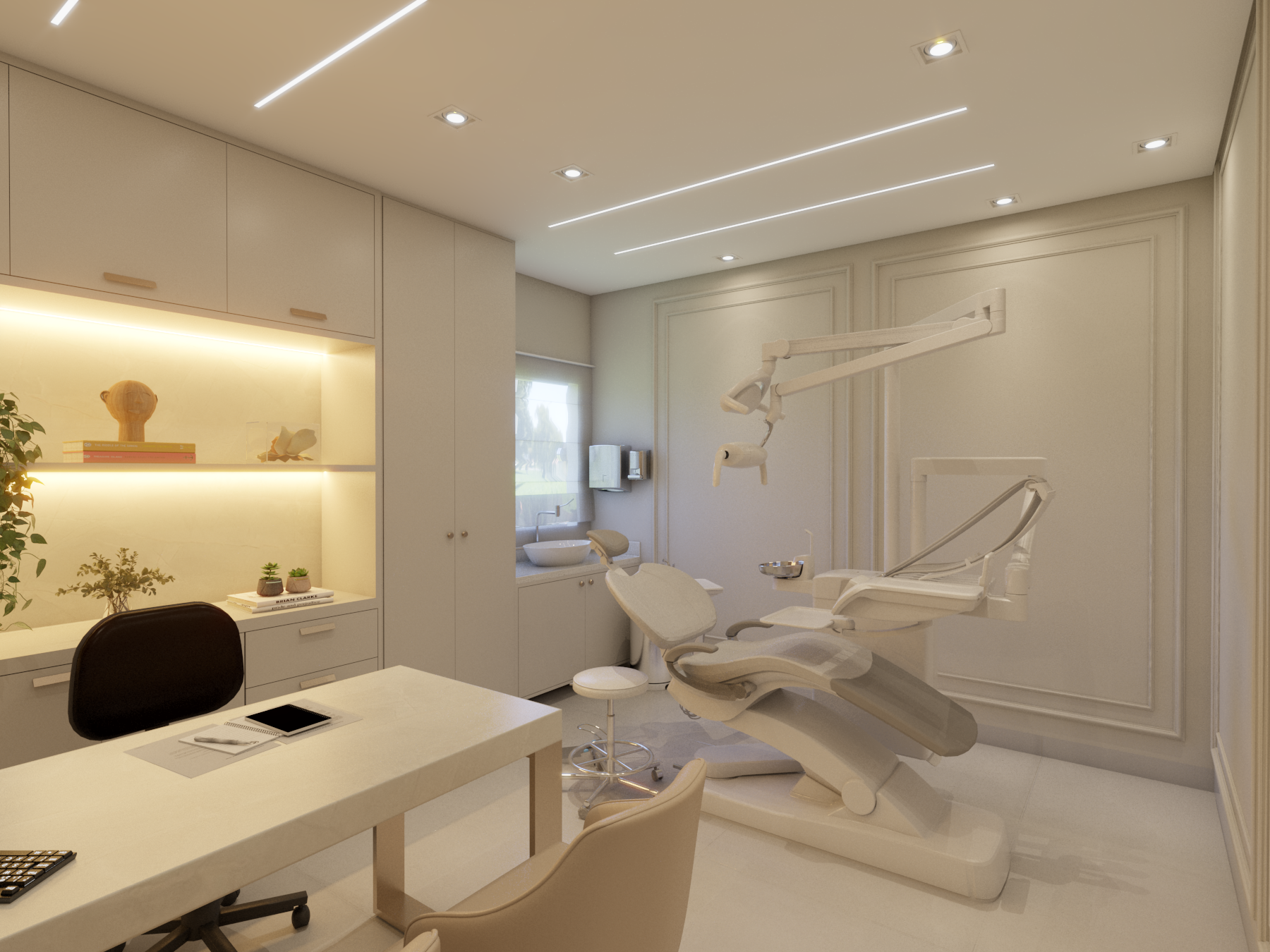 Uma reforma que vai além do layout: transformamos a experiência. Houve ajustes na estrutura interna das salas, mas o grande destaque ficou para a nova recepção e a fachada. Propusemos uma fachada mais marcante e sofisticada, usando azul marinho, branco e madeira — mantendo a identidade da marca, porém com um ar mais refinado. Na recepção, elevamos o pé-direito e usamos o azul escuro para valorizar o nome da clínica, equilibrando com tons neutros e mármores claros. Já nas salas, o foco foi criar ambientes mais agradáveis e alinhados a um público que busca um atendimento diferenciado, elegante e acolhedor.