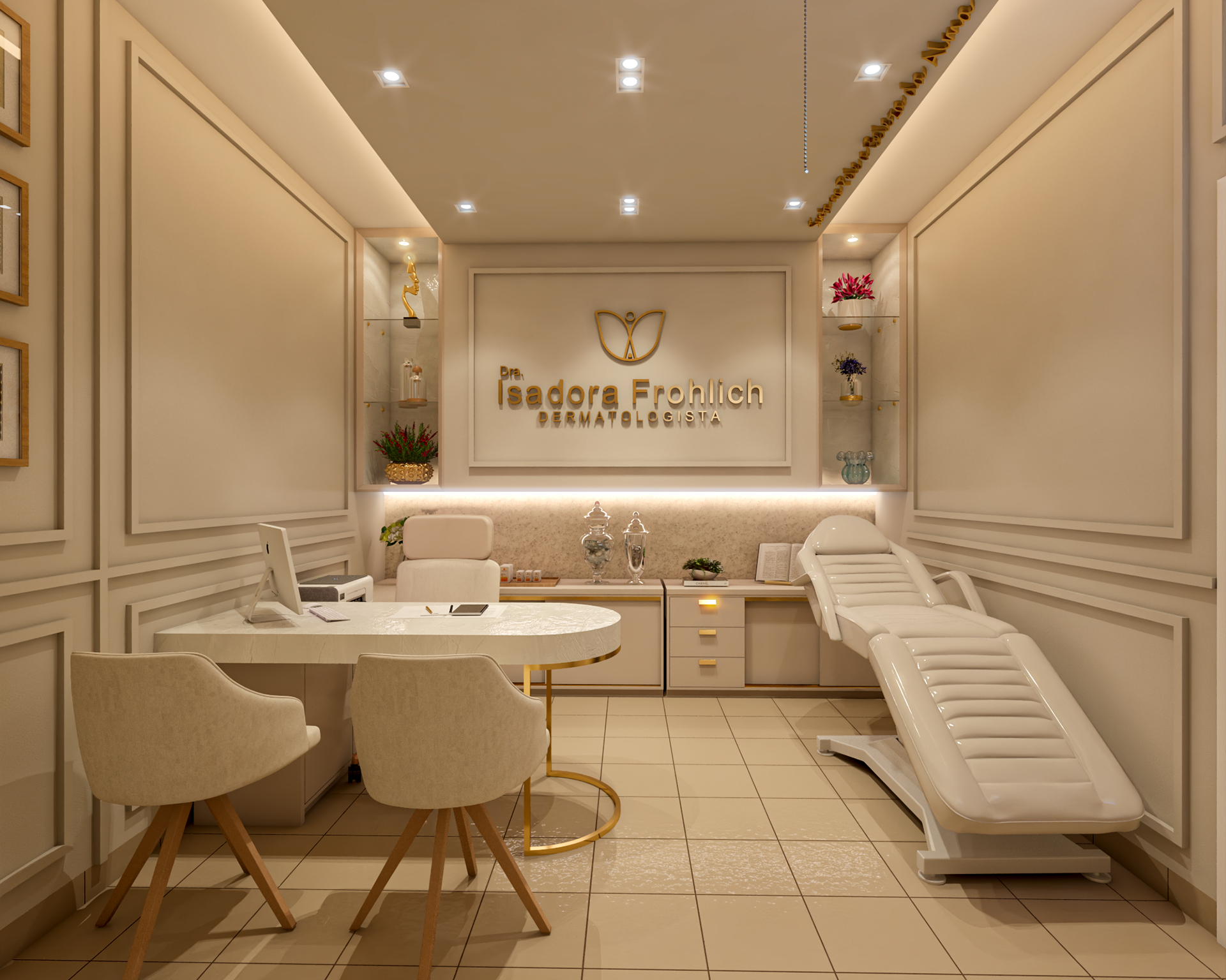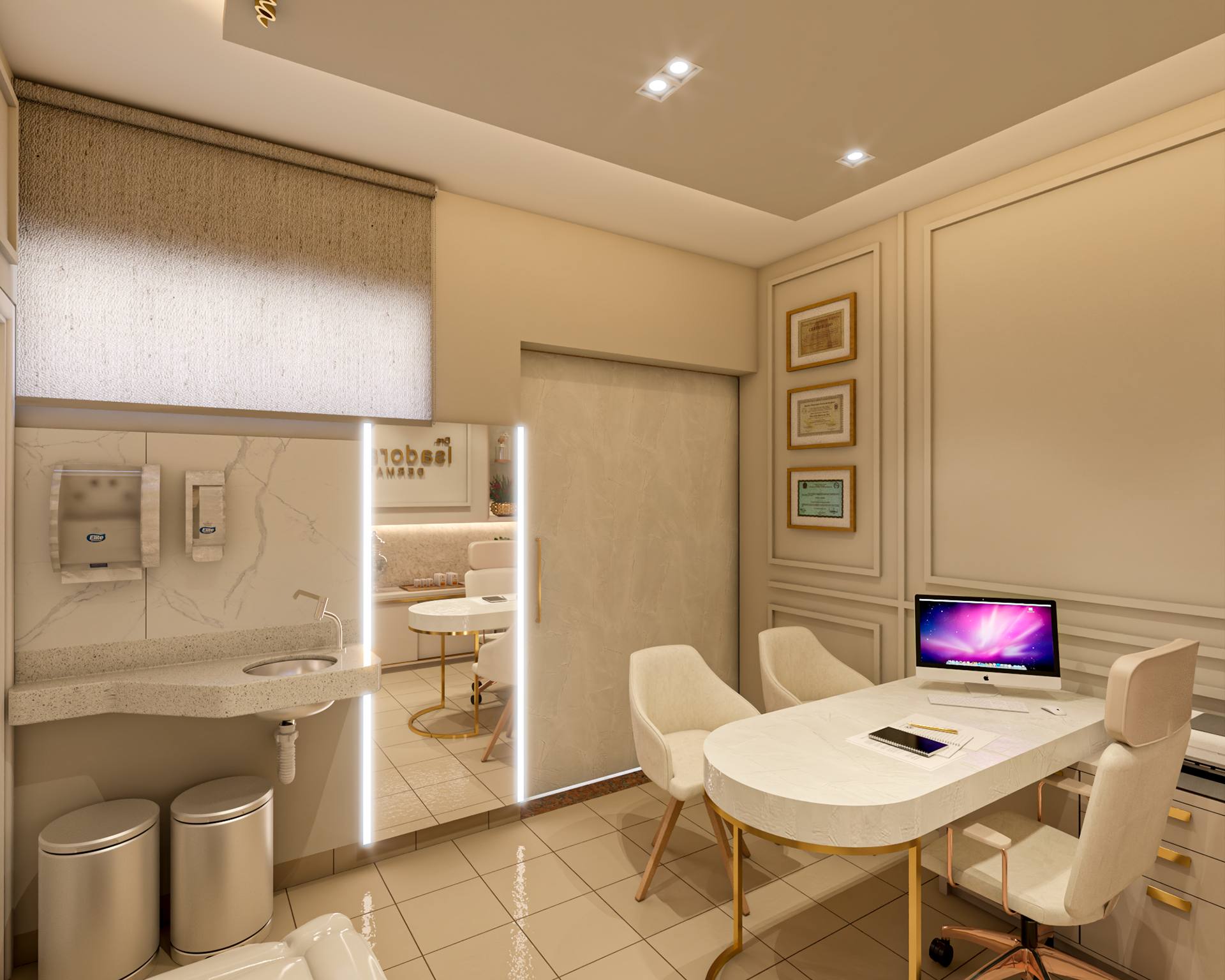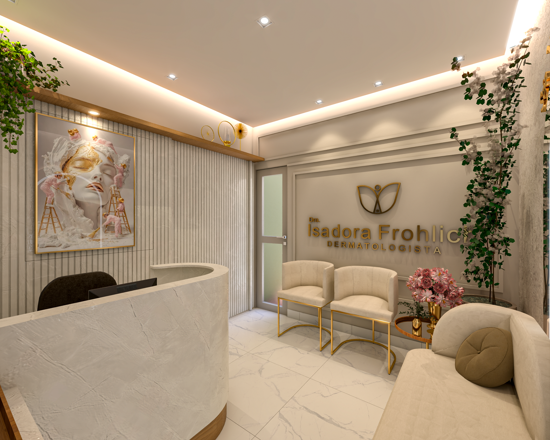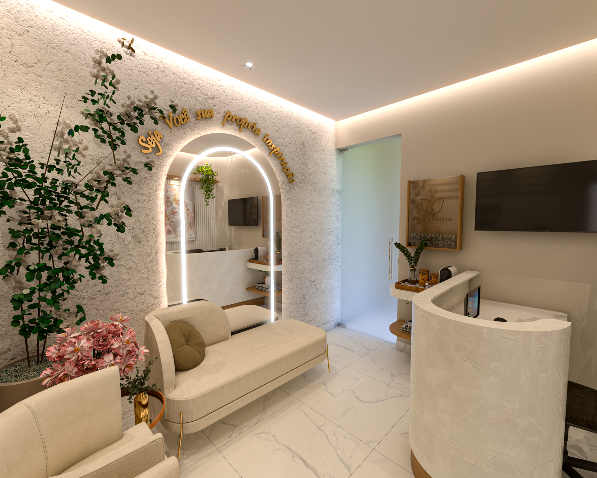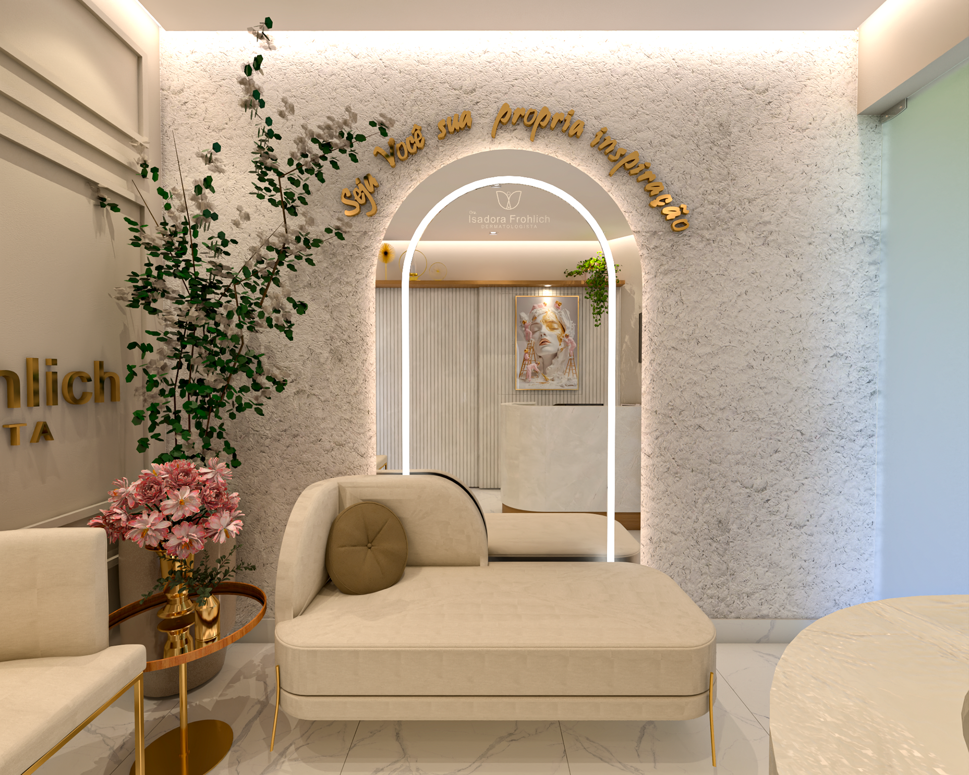 Consultório de Dermatologia pensado para encantar desde a entrada. A proposta foi criar um espaço claro, sofisticado e com um toque feminino, quase “mágico”, mas de forma elegante. Usamos muitas texturas de mármores claros no piso e nos painéis de MDF, detalhes em dourado com frases motivacionais, tons neutros e madeira para aquecer o ambiente.