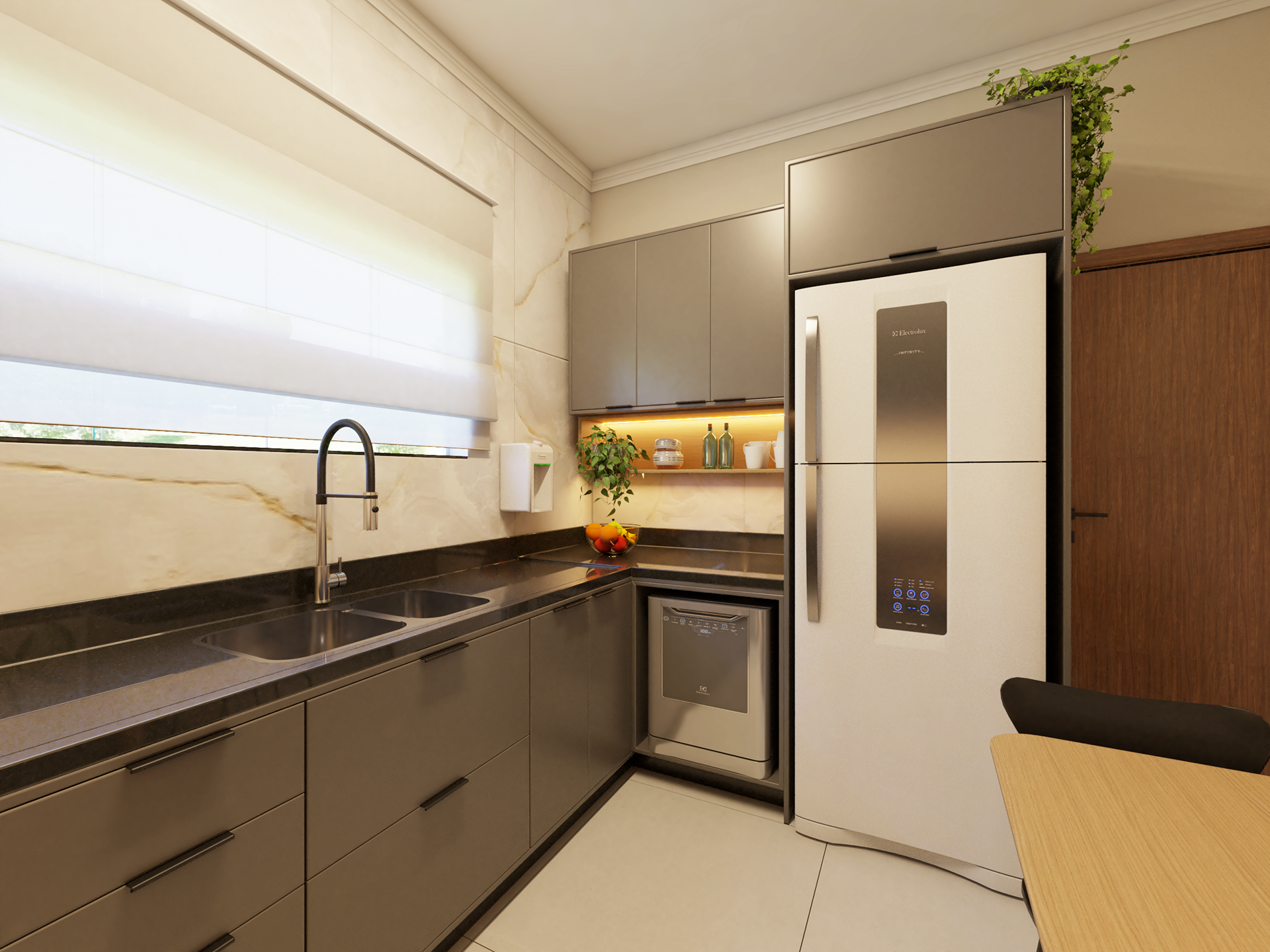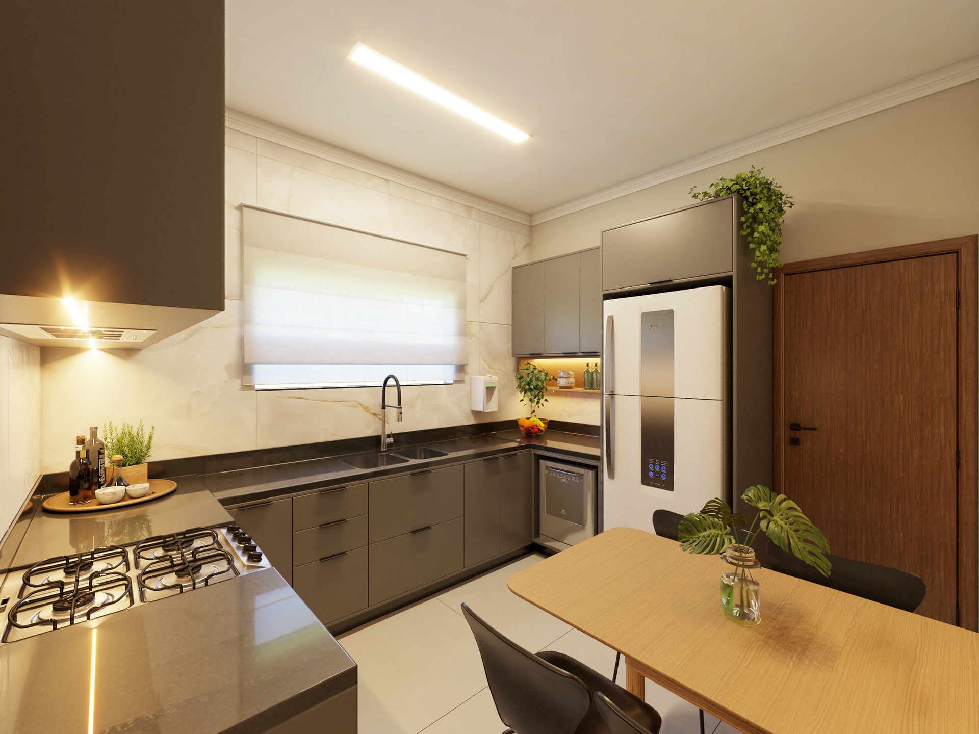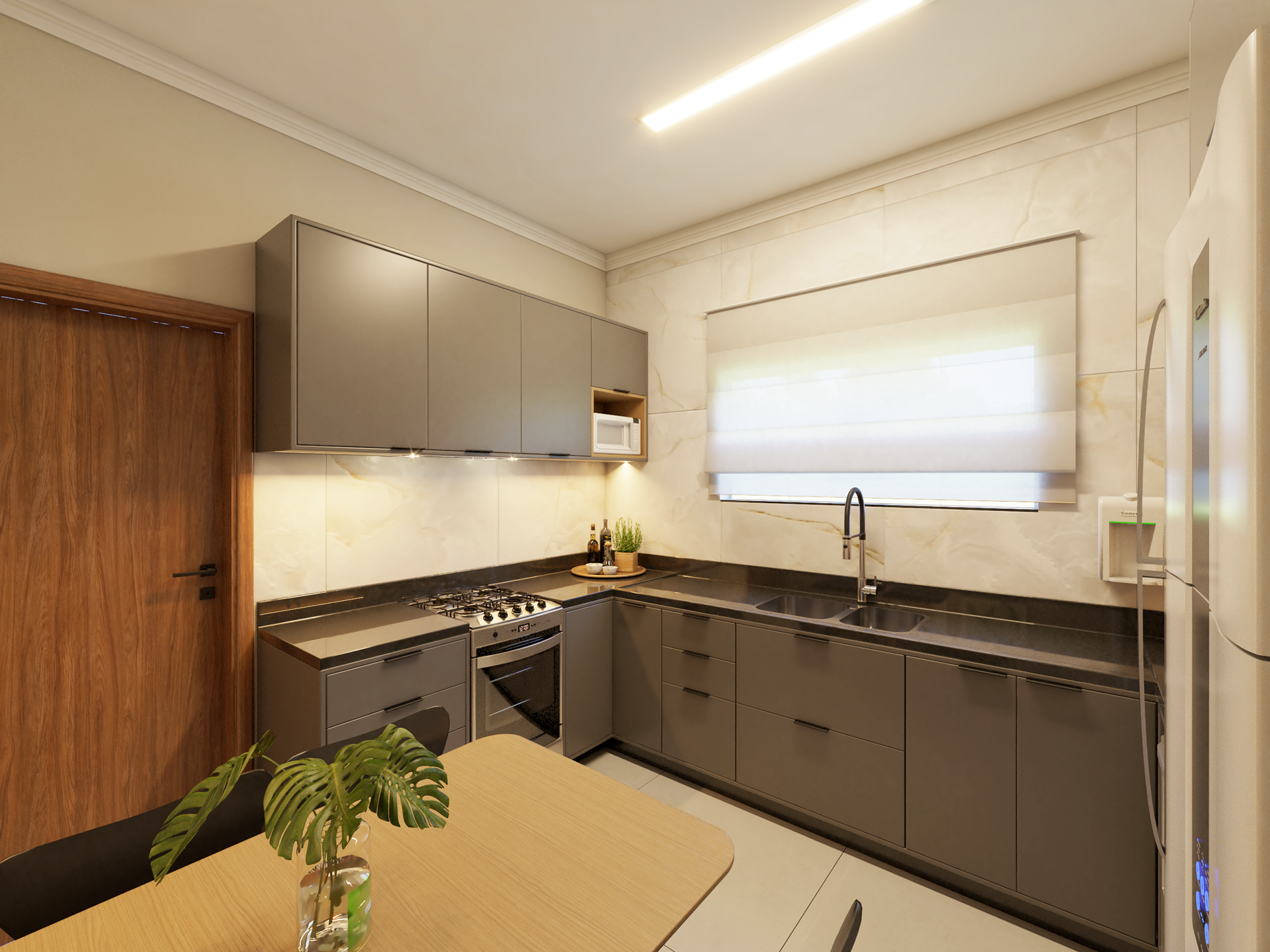 Projeto de reforma de cozinha que prova como boas escolhas transformam tudo. A cozinha já tinha um bom tamanho, mas pouca funcionalidade. Propusemos uma bancada em U de granito preto, envolvendo fogão e geladeira e deixando o uso muito mais prático. Atualizamos os revestimentos antigos por opções mais claras e modernas, e trouxemos armários em tom cinza grafite com detalhes em madeira. Mudanças pontuais, mas que fizeram toda a diferença no visual e no dia a dia.