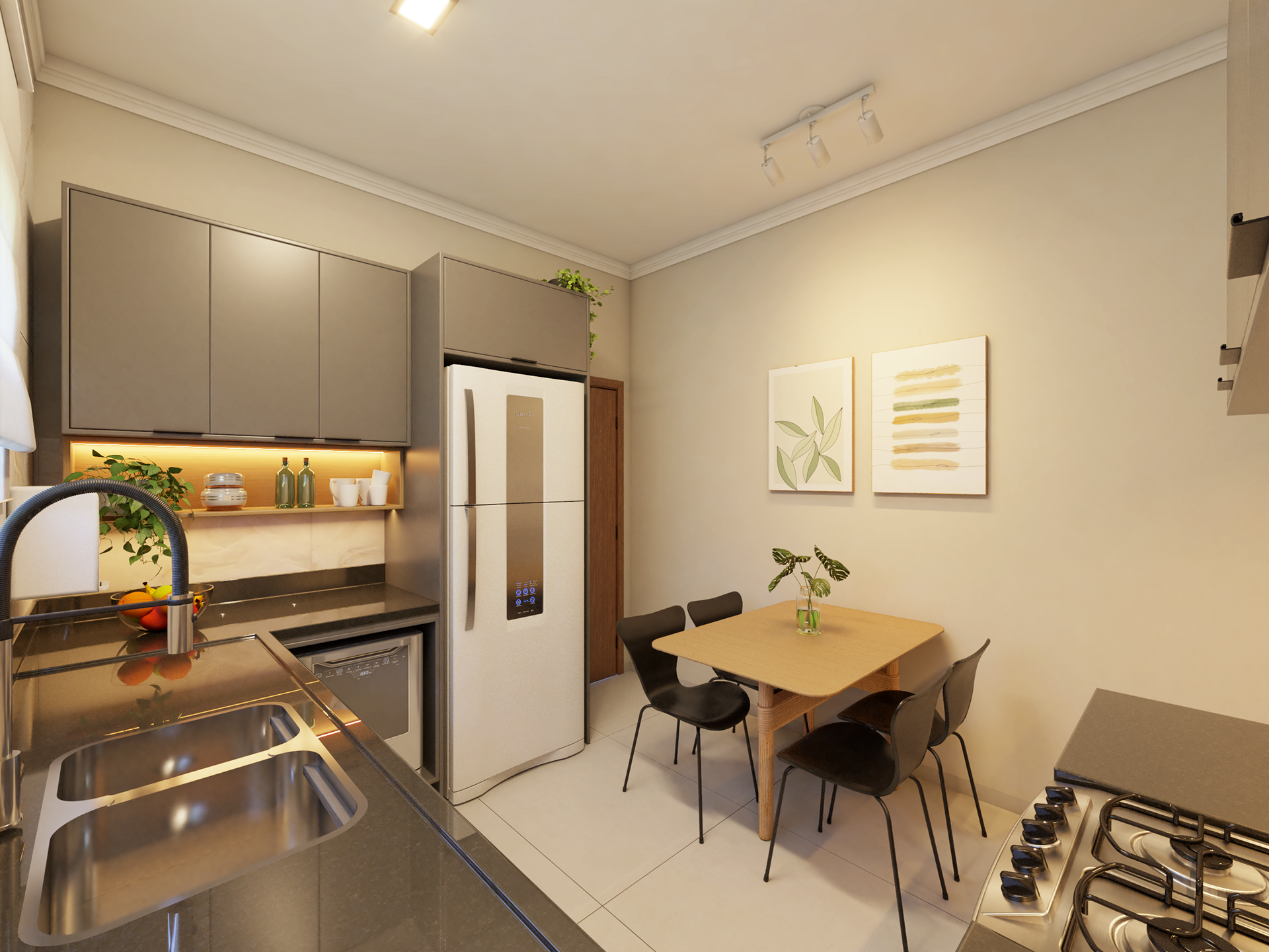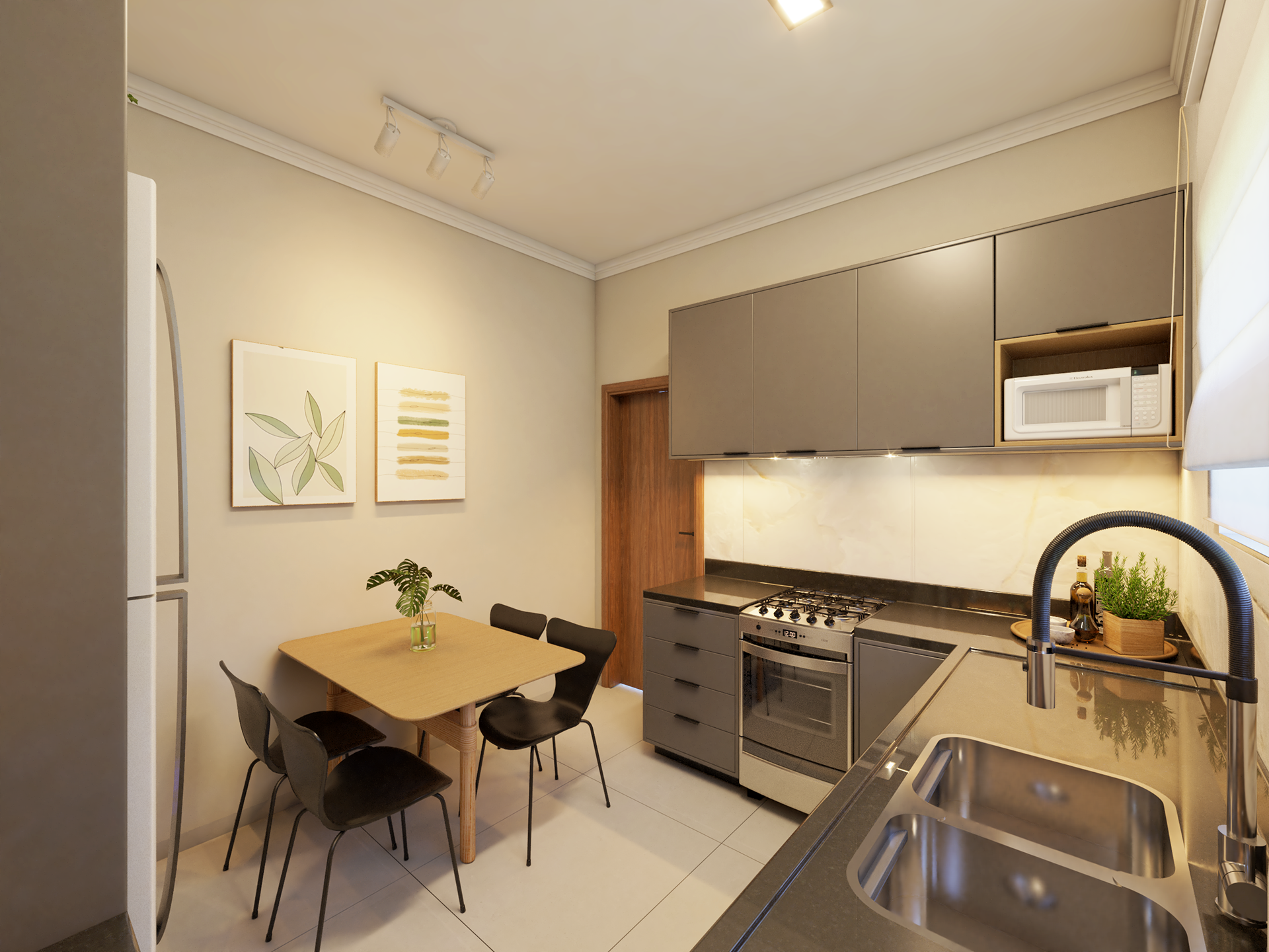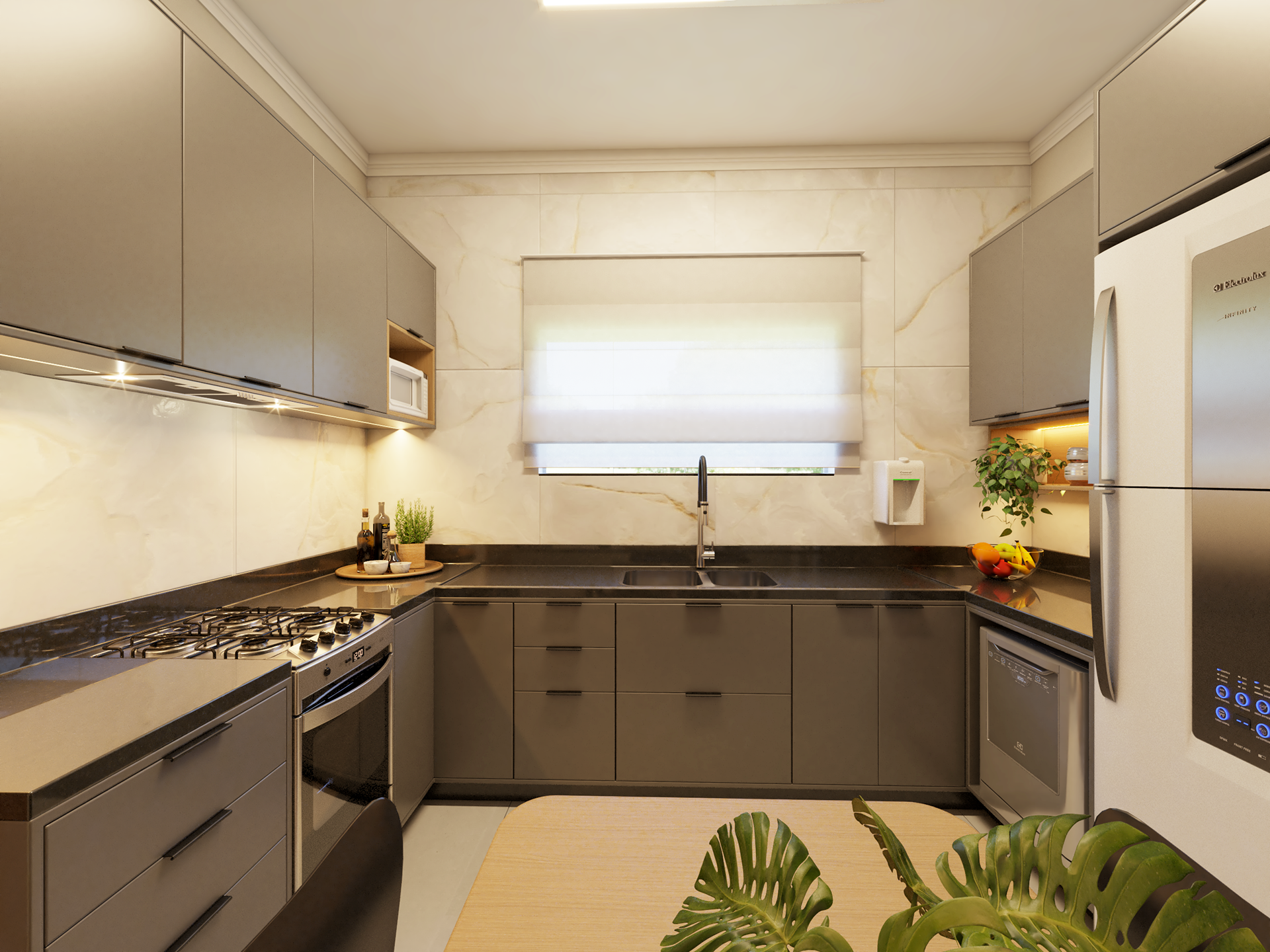 Projeto de reforma de cozinha que prova como boas escolhas transformam tudo. A cozinha já tinha um bom tamanho, mas pouca funcionalidade. Propusemos uma bancada em U de granito preto, envolvendo fogão e geladeira e deixando o uso muito mais prático. Atualizamos os revestimentos antigos por opções mais claras e modernas, e trouxemos armários em tom cinza grafite com detalhes em madeira. Mudanças pontuais, mas que fizeram toda a diferença no visual e no dia a dia.