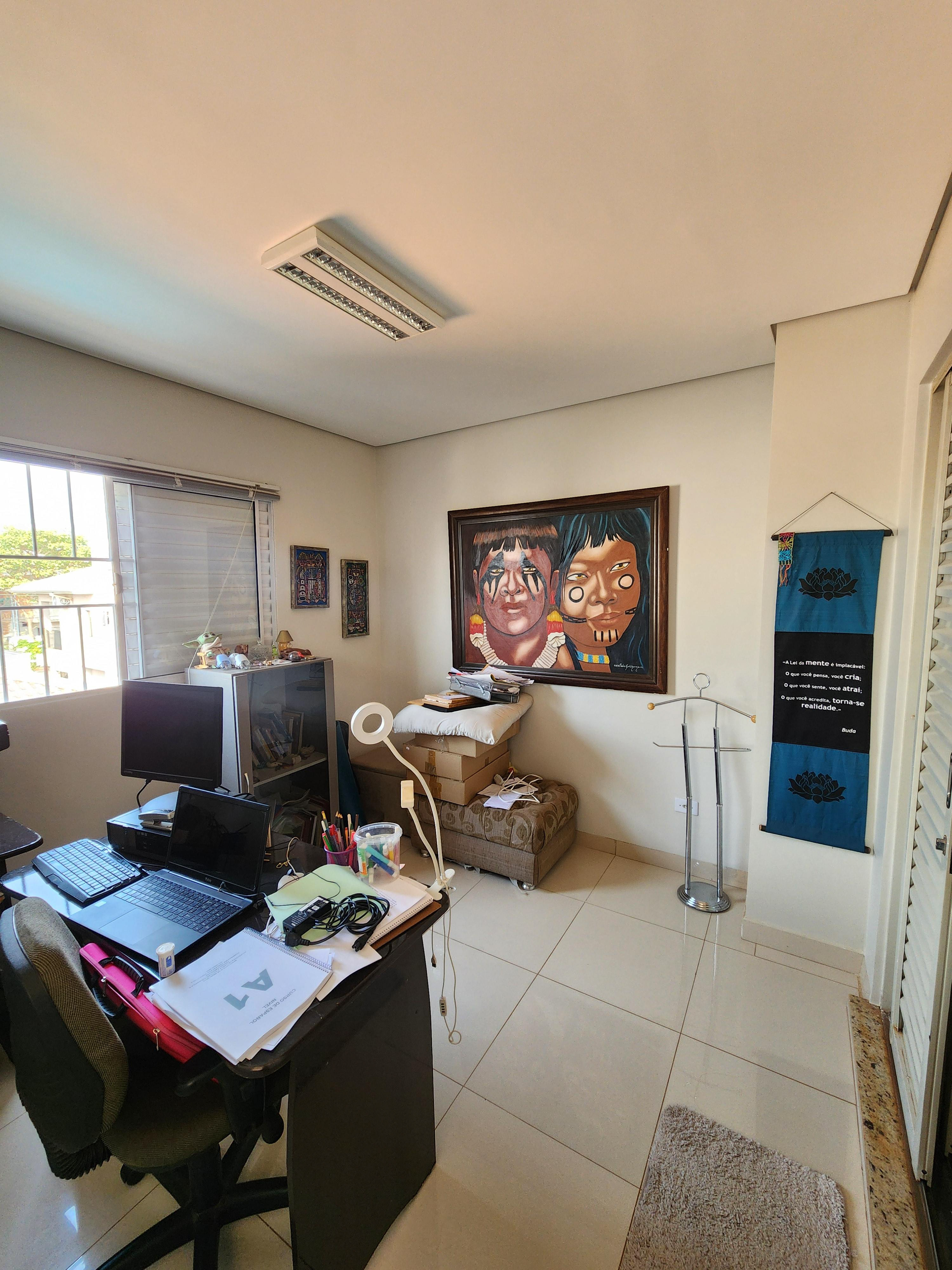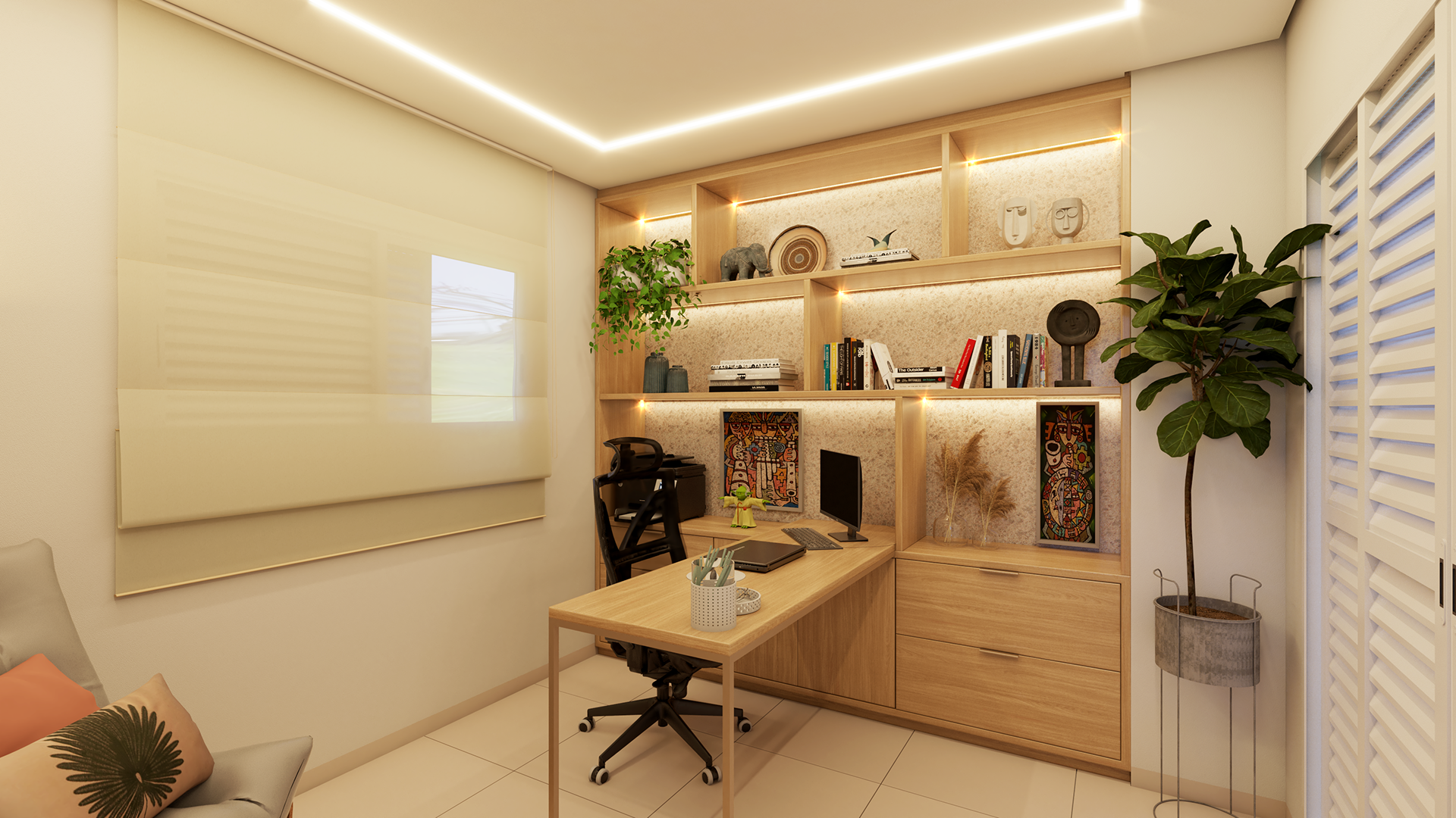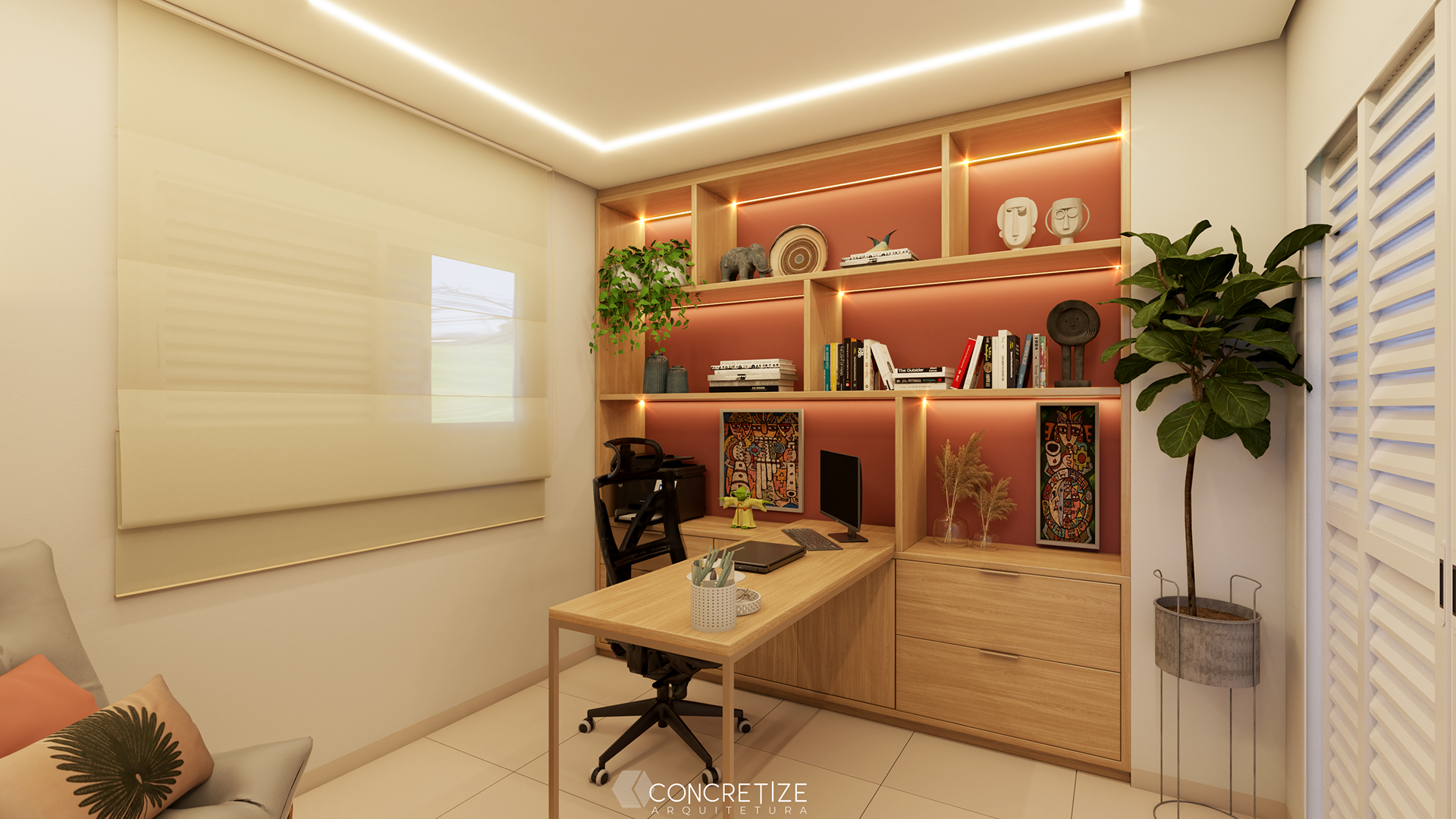 No escritório, o desafio era a falta de espaço para organizar tudo: mesa pequena, muitos itens de uso diário e objetos lindos de viagens que mereciam destaque. Criamos então uma grande estante sob medida, com nichos para livros e peças decorativas, e armazenamento fechado na parte inferior para o que não precisava ficar à mostra. Integrada a ela, uma mesa maior, confortável para o computador e o notebook usados no dia a dia. Mantivemos os quadros que ela já tinha e, a partir deles e das nossas conversas, propusemos o tom terracota ao fundo para destacar a estante — com uma base neutra, equilibrando personalidade e elegância.