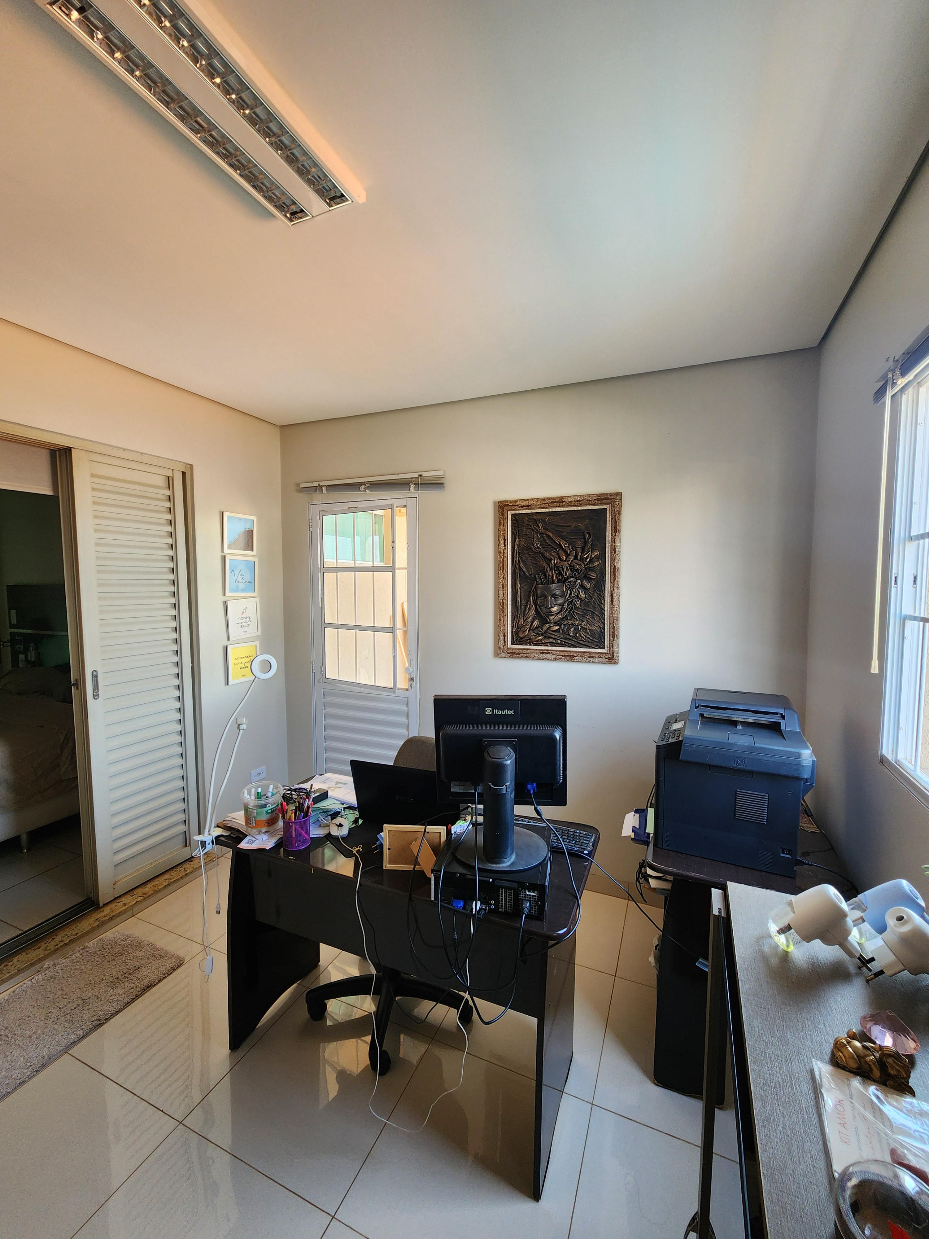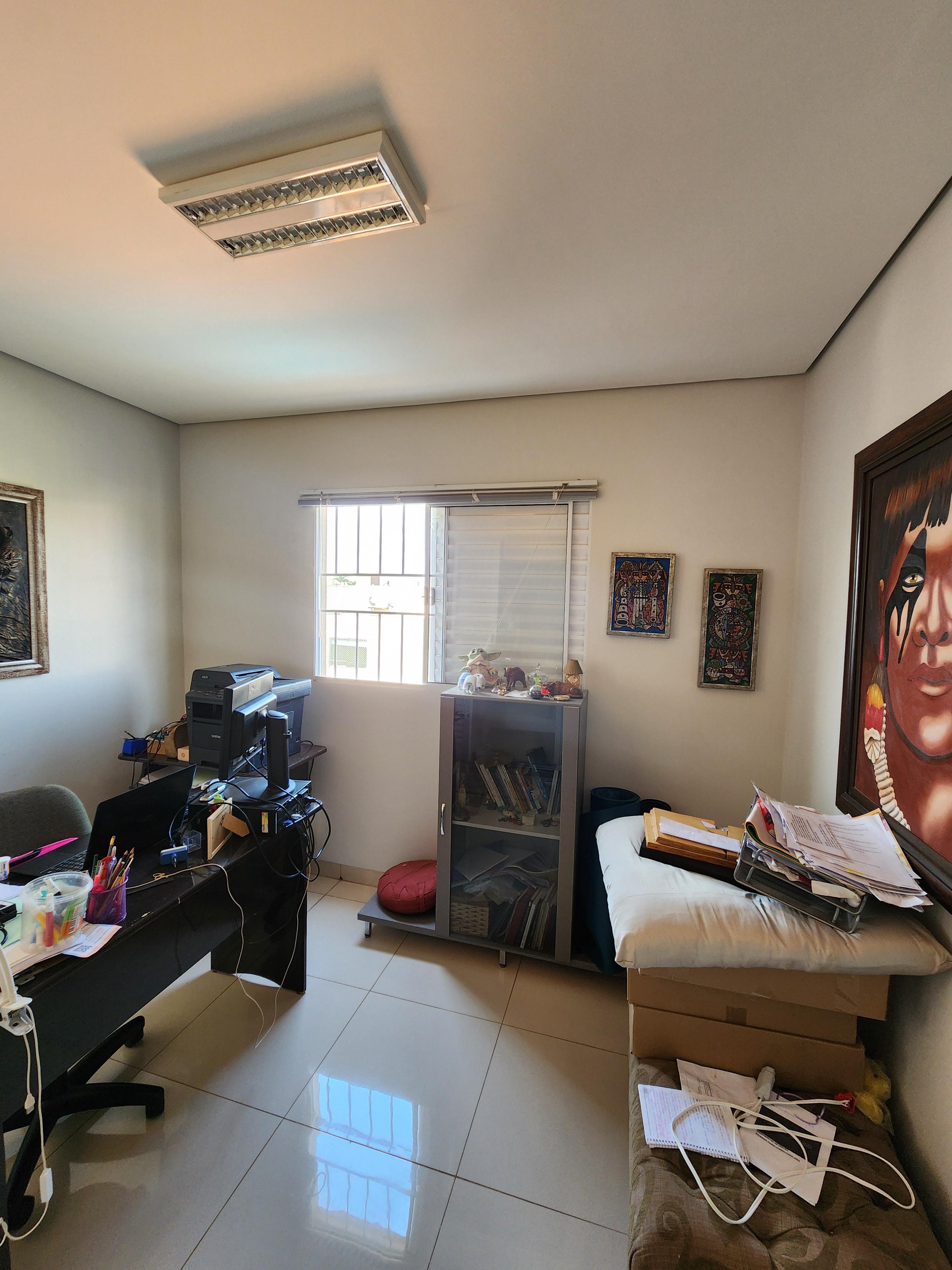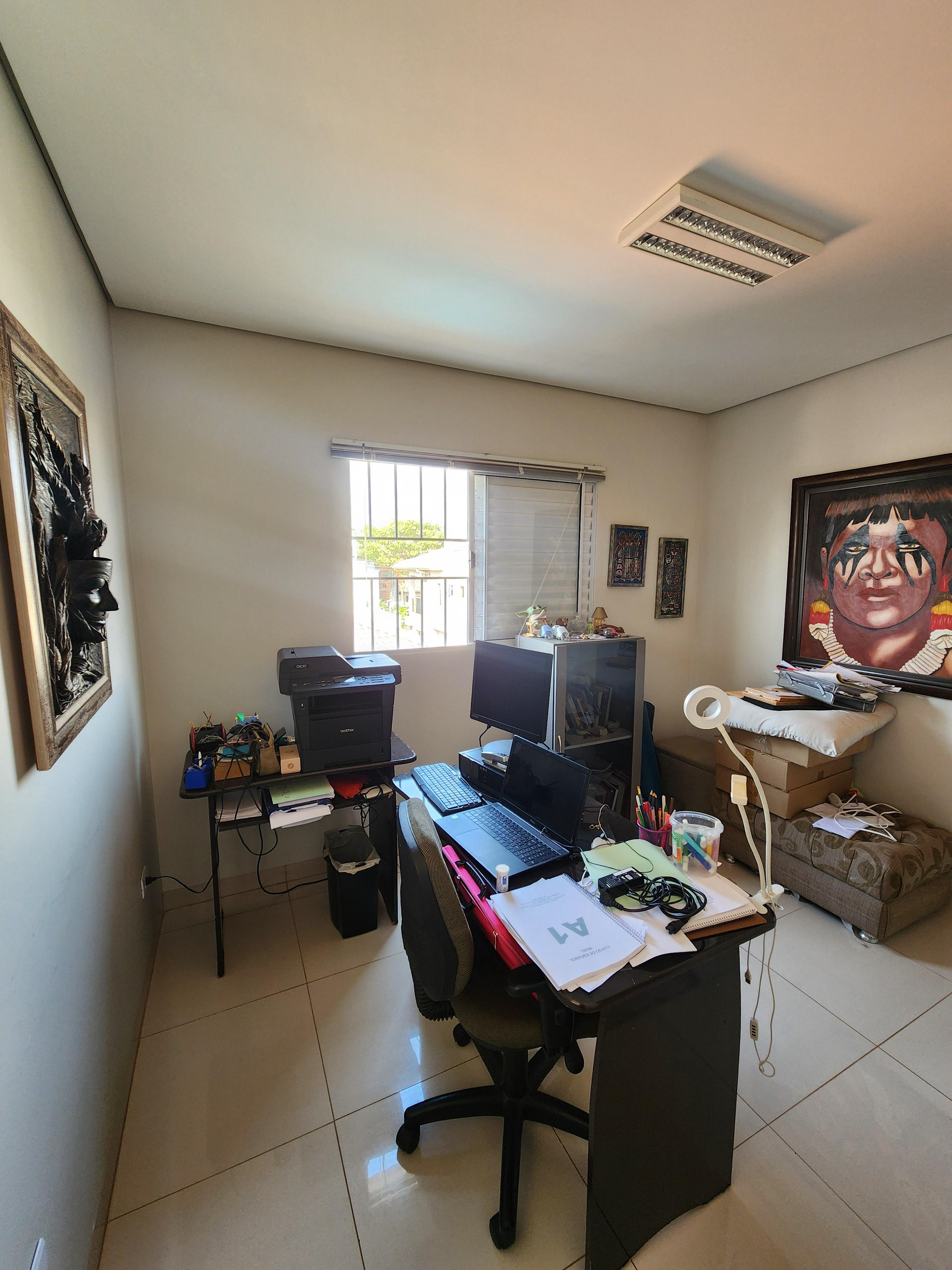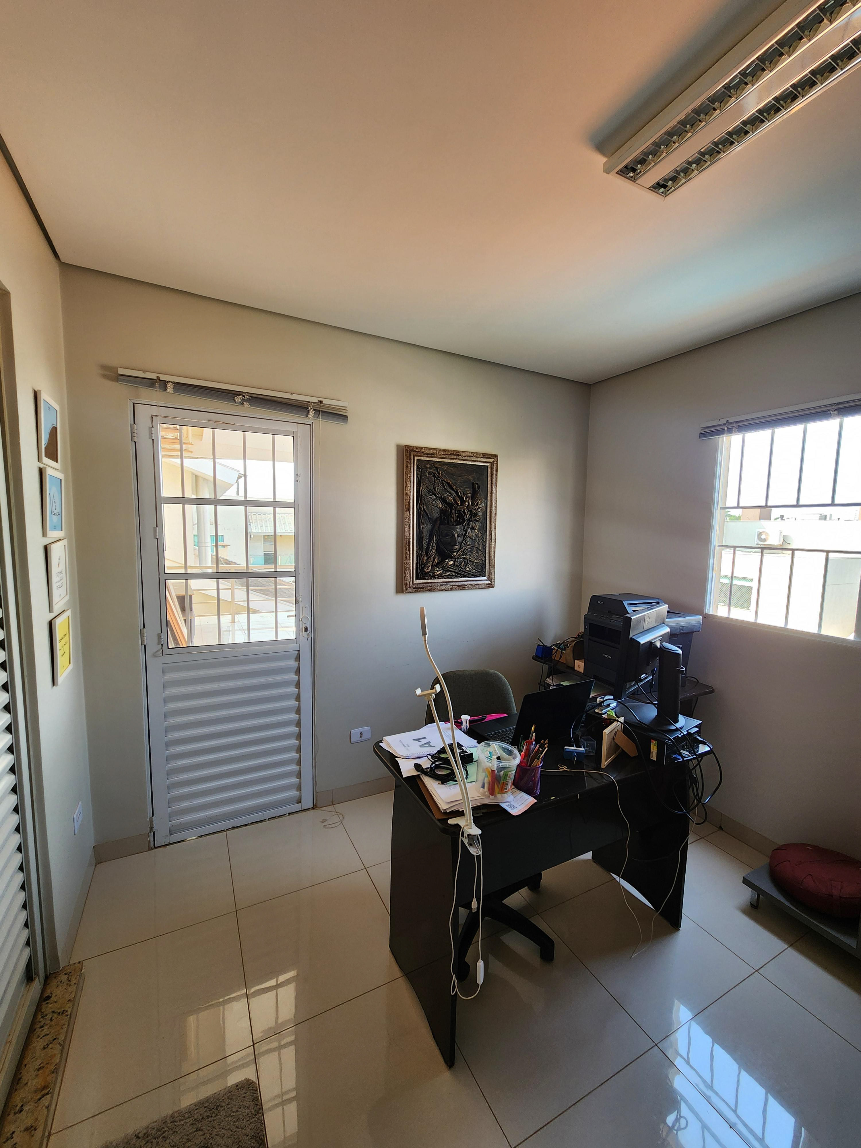 No escritório, o desafio era a falta de espaço para organizar tudo: mesa pequena, muitos itens de uso diário e objetos lindos de viagens que mereciam destaque. Criamos então uma grande estante sob medida, com nichos para livros e peças decorativas, e armazenamento fechado na parte inferior para o que não precisava ficar à mostra. Integrada a ela, uma mesa maior, confortável para o computador e o notebook usados no dia a dia. Mantivemos os quadros que ela já tinha e, a partir deles e das nossas conversas, propusemos o tom terracota ao fundo para destacar a estante — com uma base neutra, equilibrando personalidade e elegância.