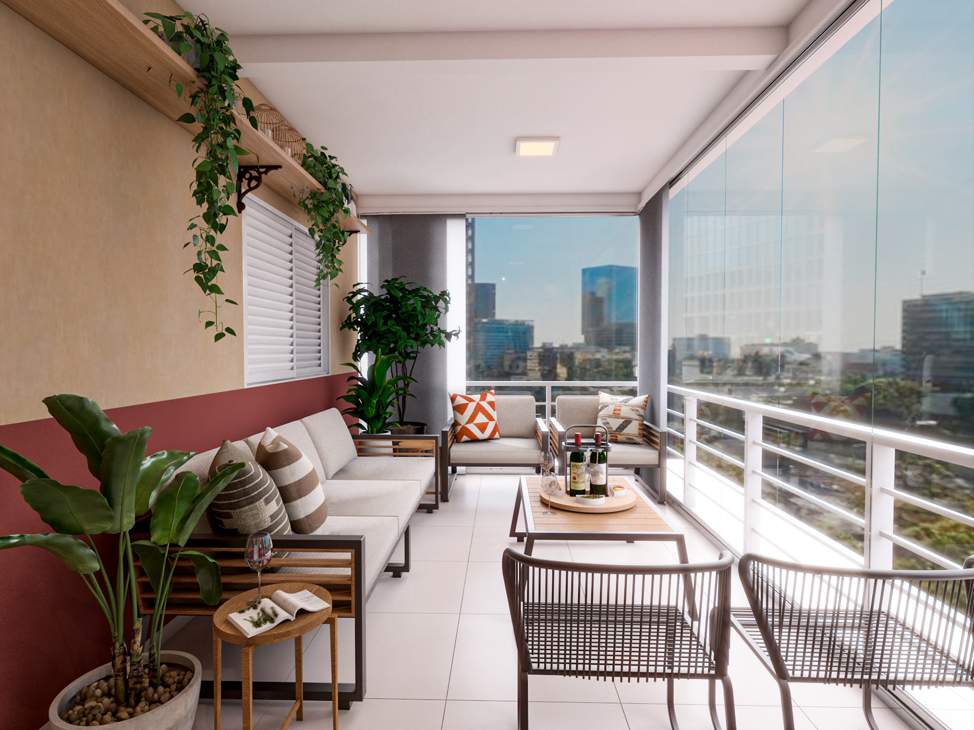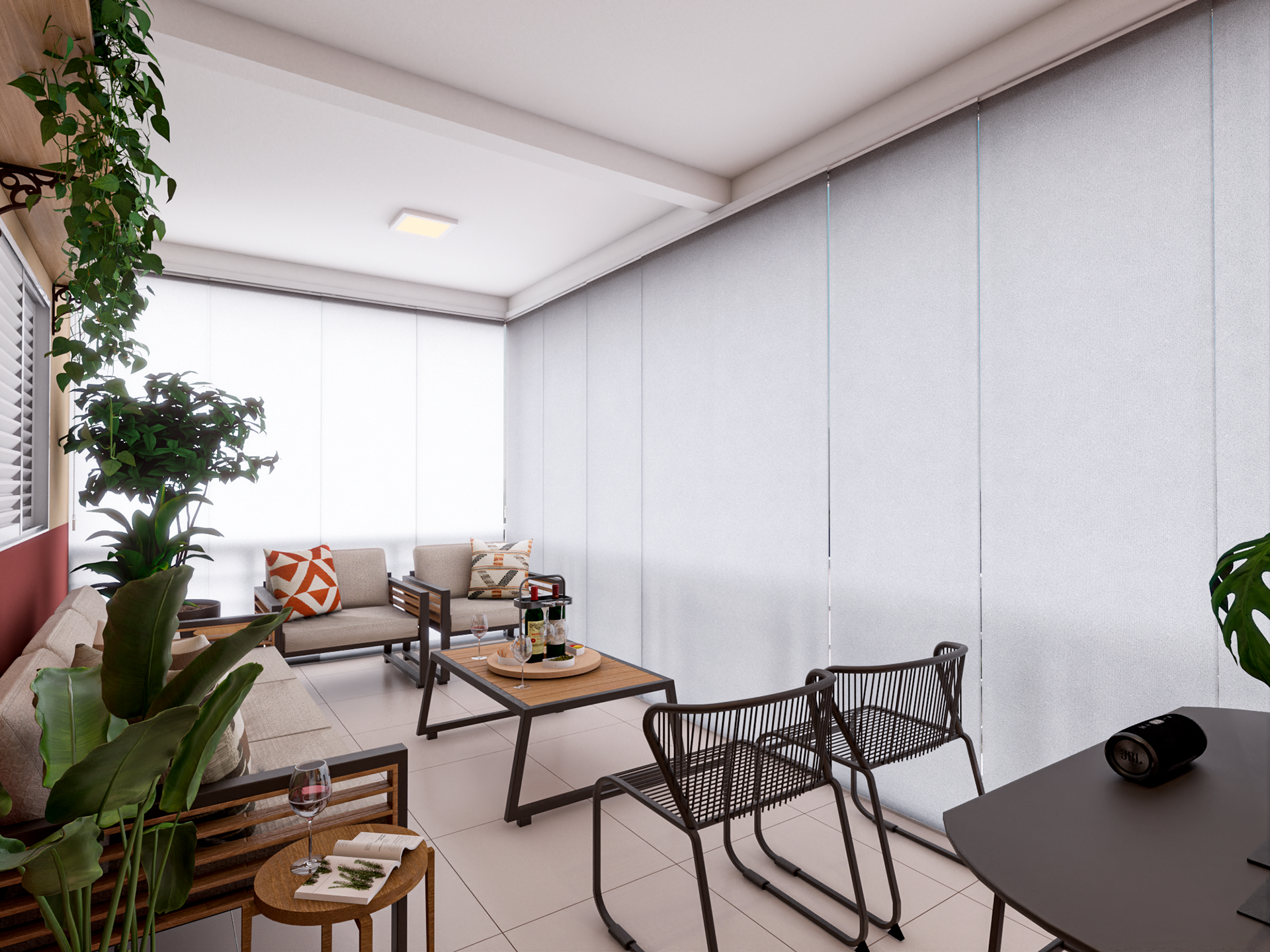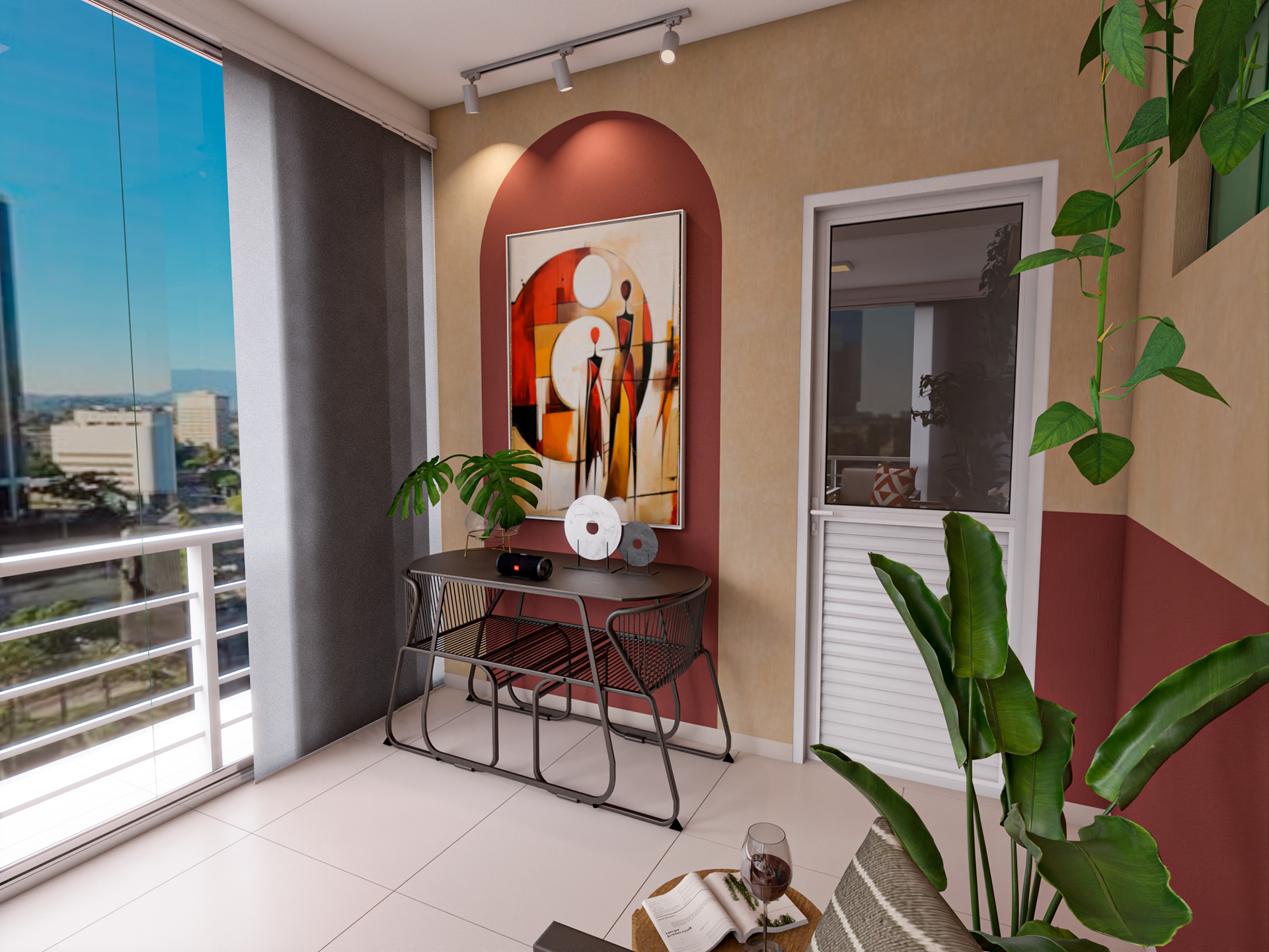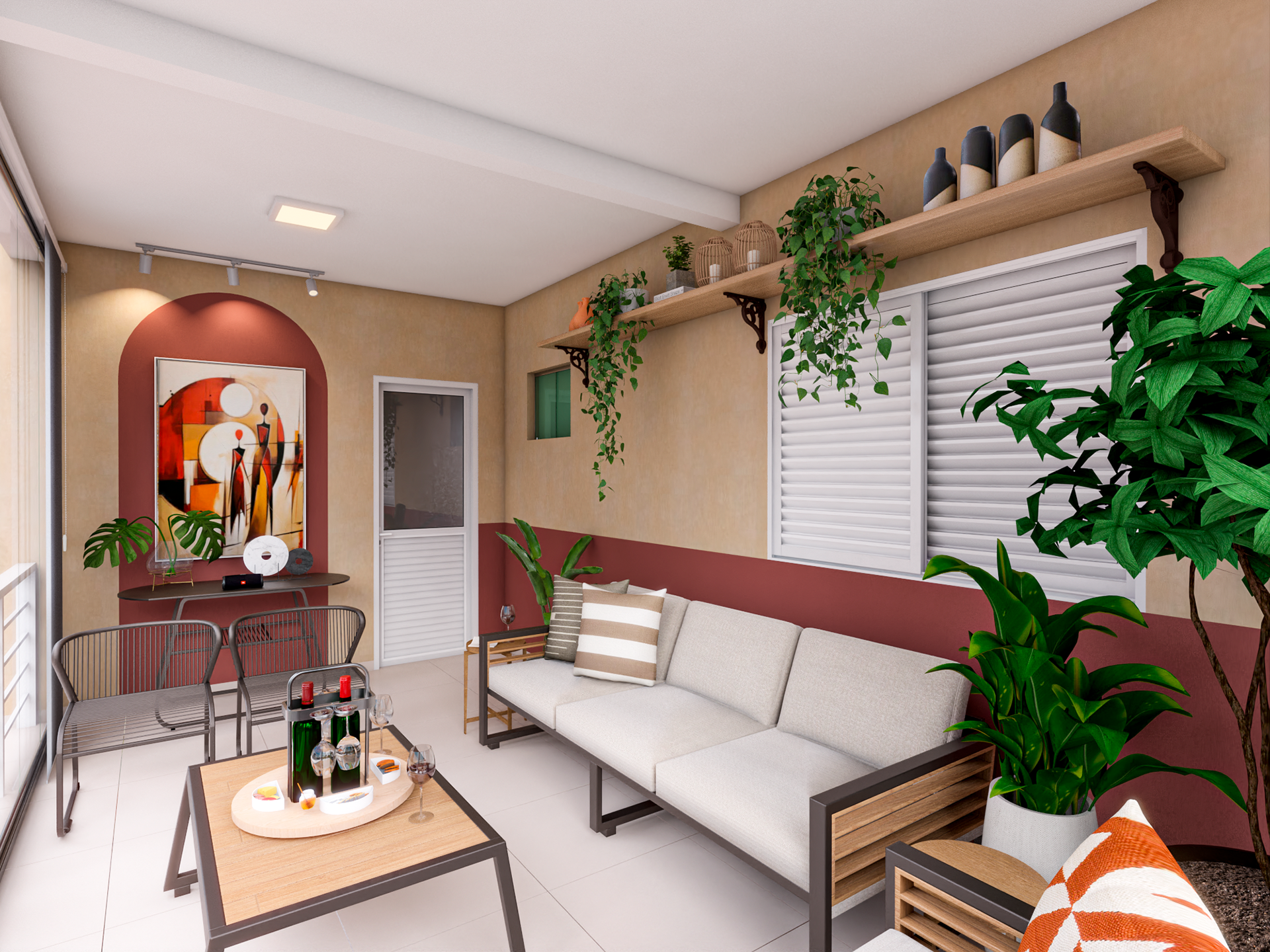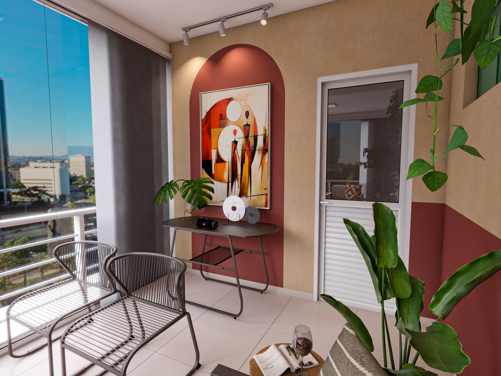 Já na varanda, a proposta foi transformá-la em um espaço de estar. Fechamos com portas de vidro, que podem ser abertas quando quiserem, e retomamos o terracota em meia parede com um arco, valorizando um quadro e trazendo identidade ao ambiente. O mobiliário foi pensado para conforto e flexibilidade: sofá, poltronas, mesa de centro e um aparador metálico com cadeiras encaixáveis, perfeito para receber mais visitas.