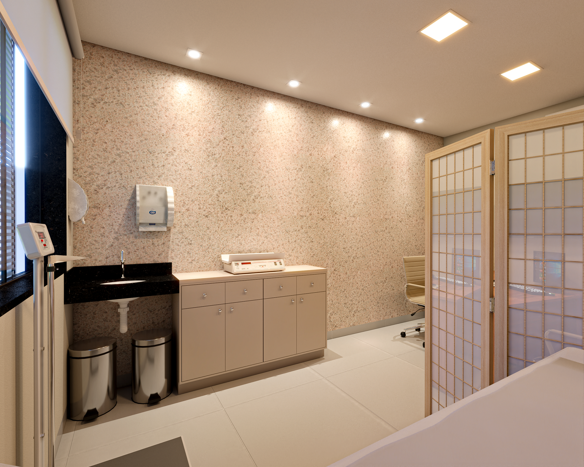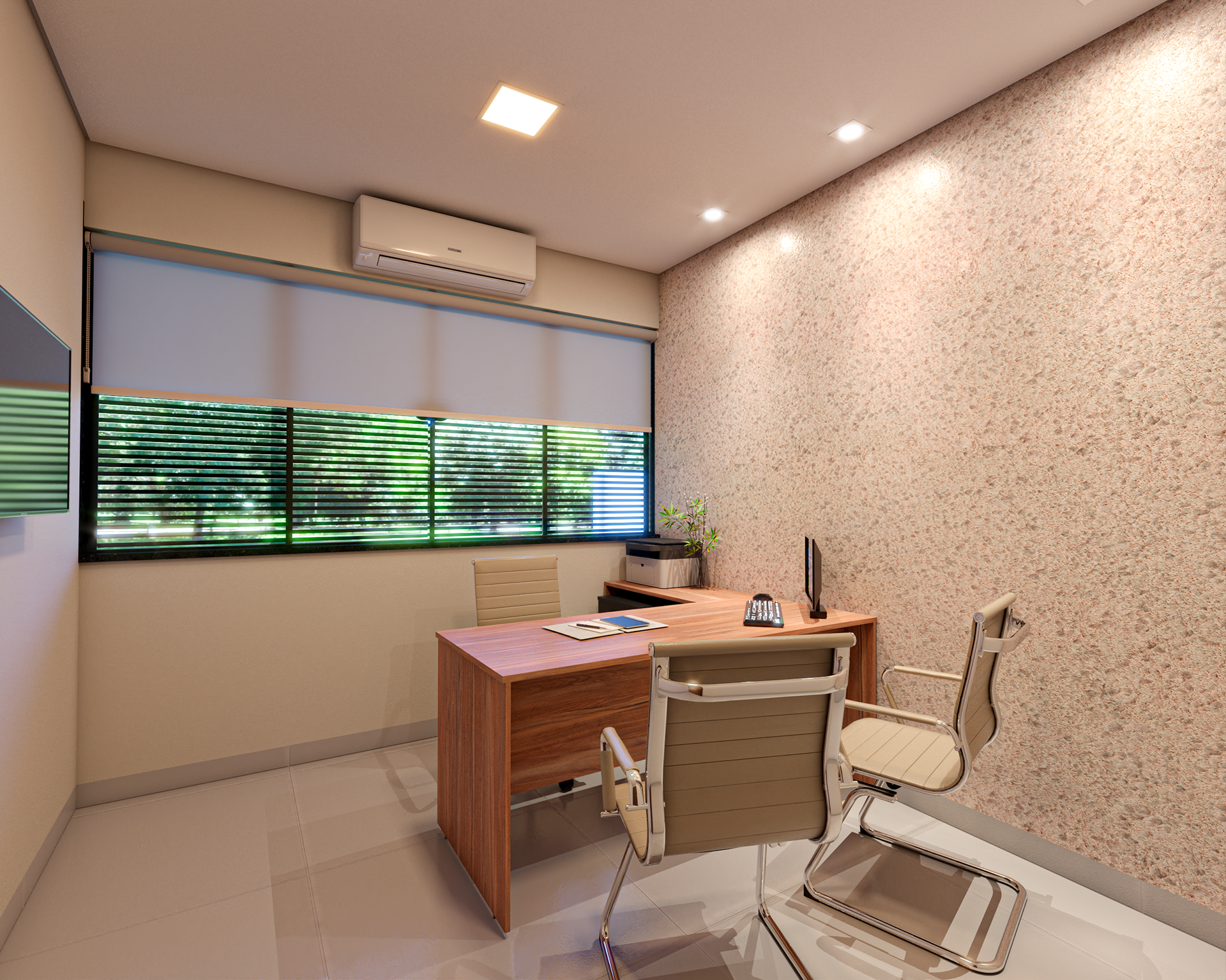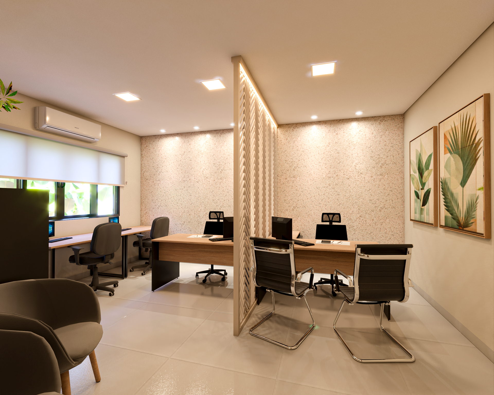 A recepção ganhou uma mesa ampla de atendimento, com um painel ao fundo valorizando a logo e cadeiras confortáveis para a espera. No administrativo, criamos uma divisória com elemento vazado, que mantém a sensação de abertura sem abrir mão da privacidade. Já as salas médicas são práticas e funcionais, mas receberam um toque especial com o papel de parede líquido, trazendo textura e charme na medida certa.
