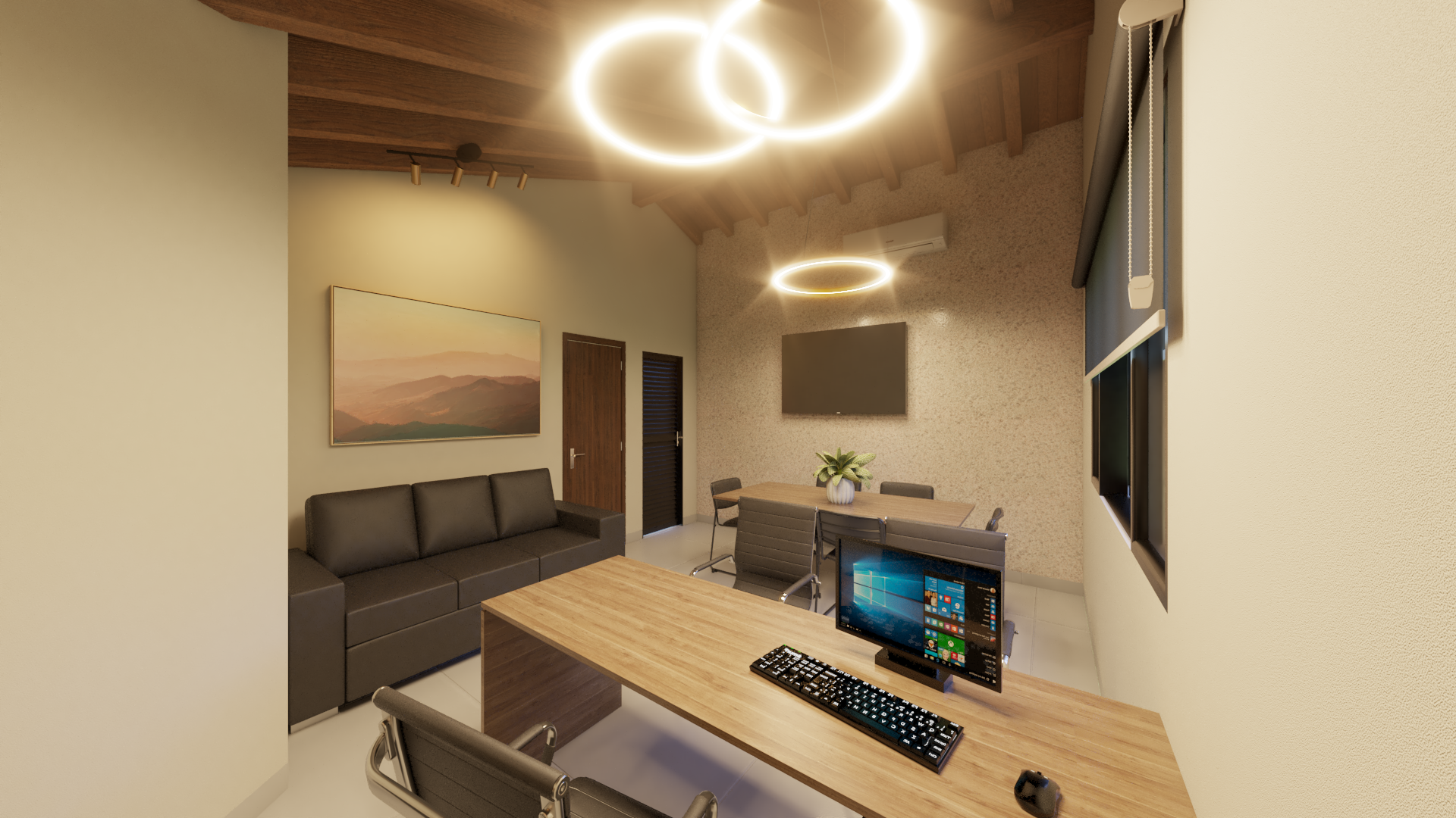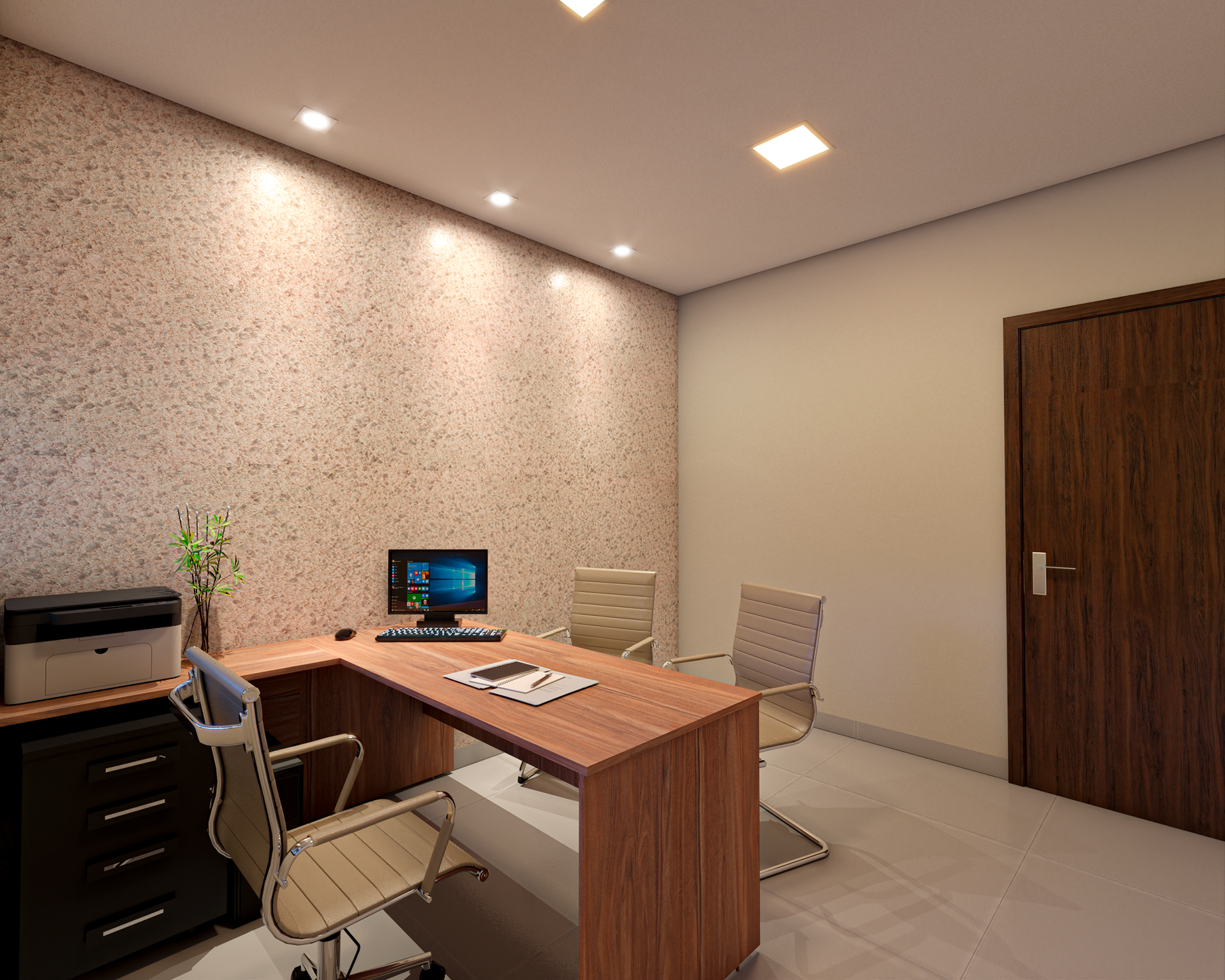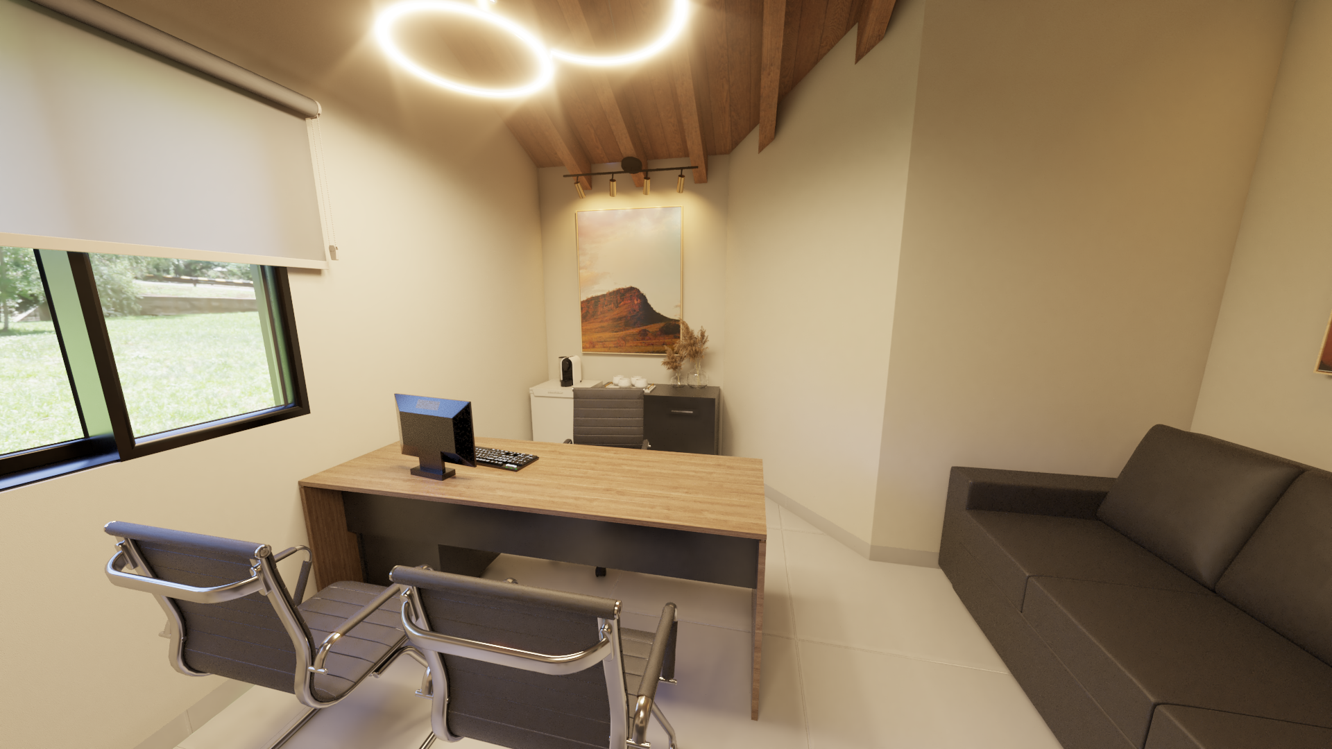 A recepção ganhou uma mesa ampla de atendimento, com um painel ao fundo valorizando a logo e cadeiras confortáveis para a espera. No administrativo, criamos uma divisória com elemento vazado, que mantém a sensação de abertura sem abrir mão da privacidade. Já as salas médicas são práticas e funcionais, mas receberam um toque especial com o papel de parede líquido, trazendo textura e charme na medida certa.