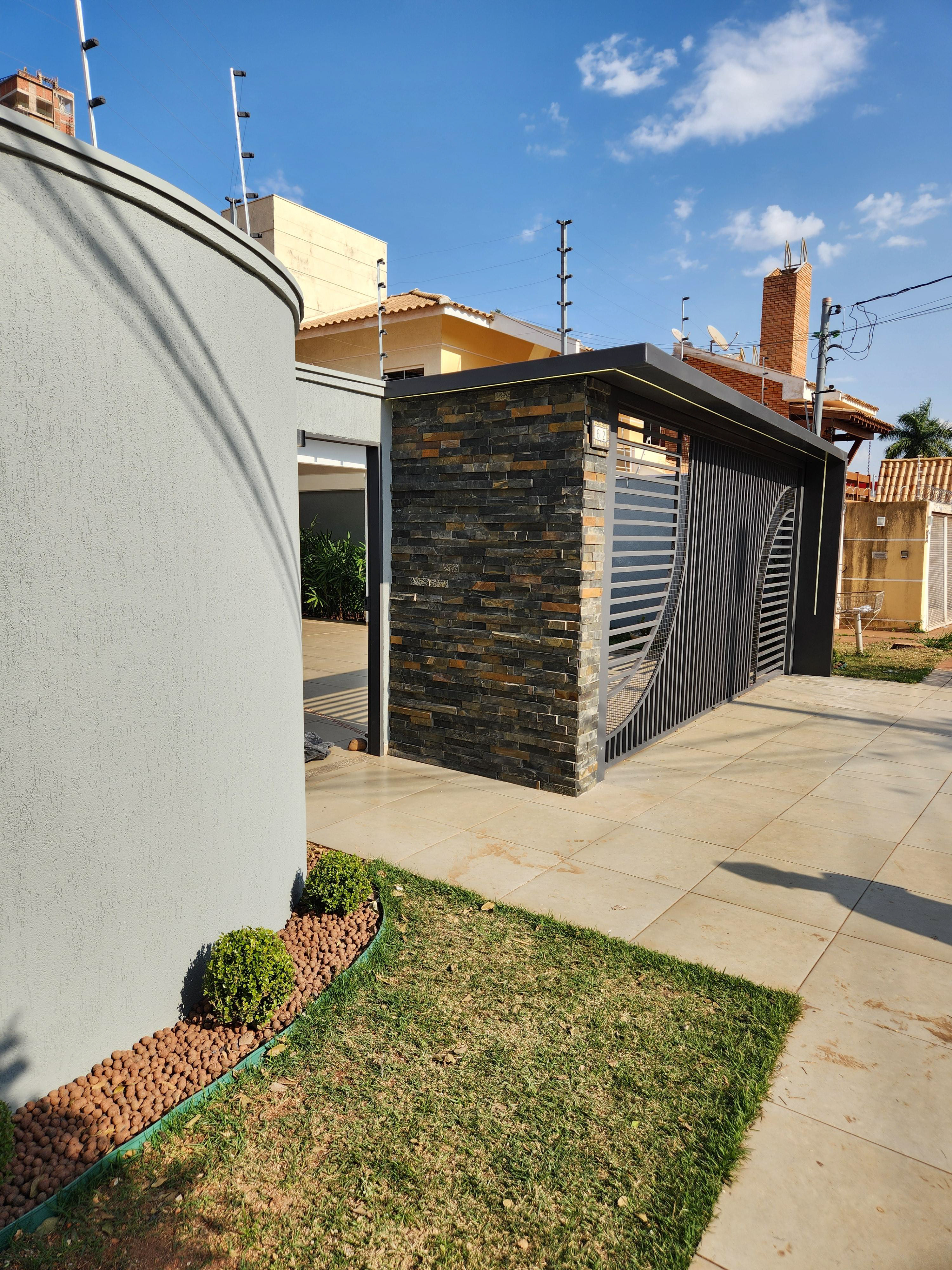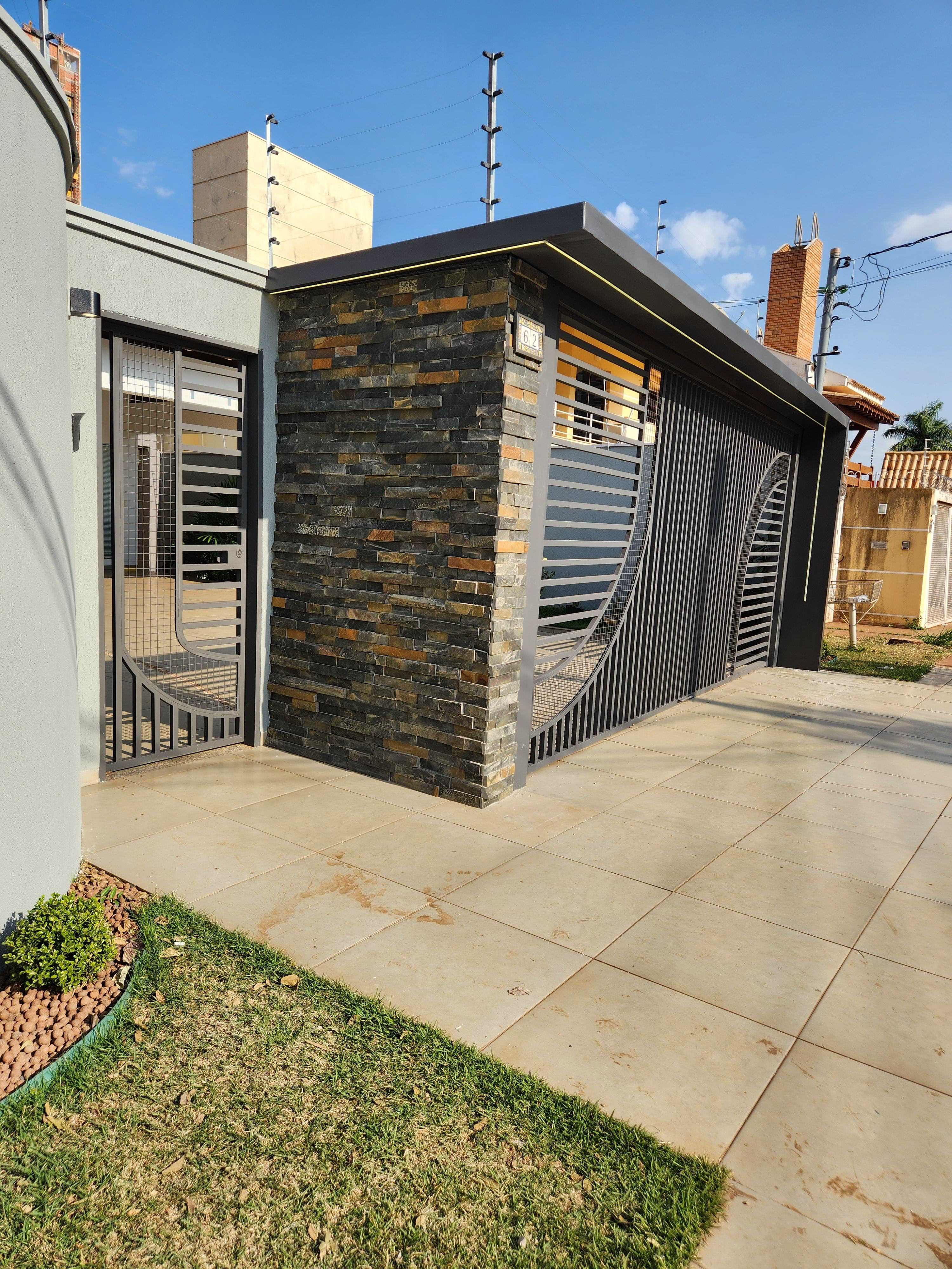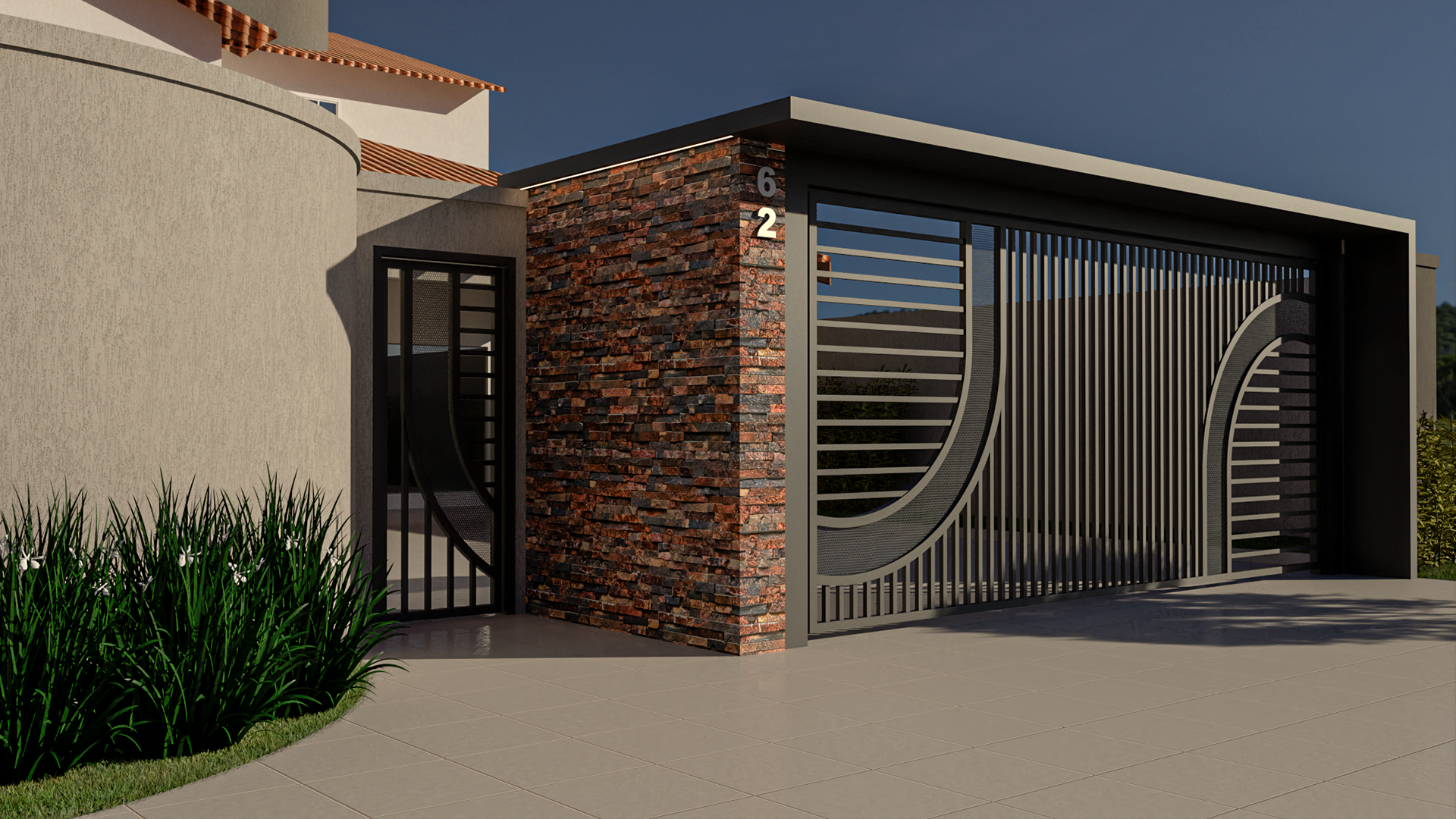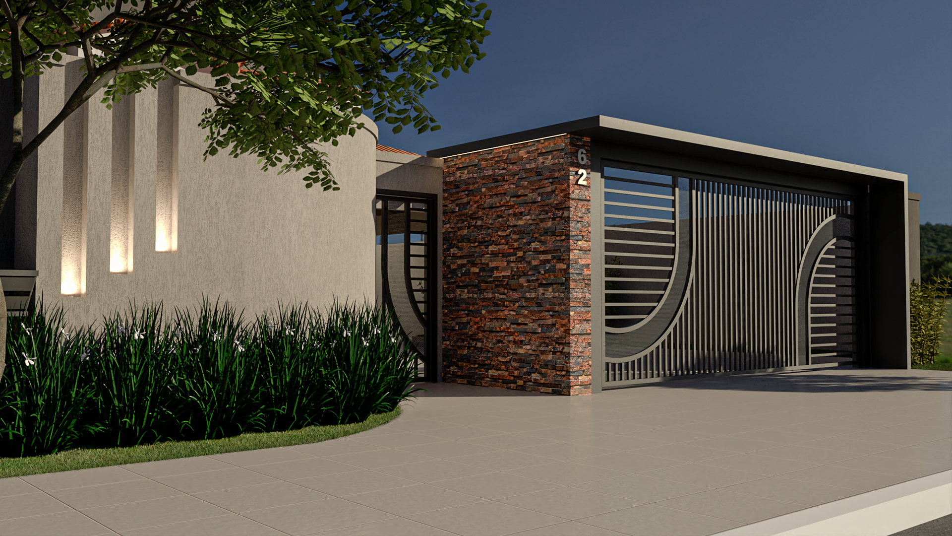 Criamos um detalhe de serralheria no portão, com iluminação embutida, trazendo mais personalidade e sofisticação. No muro e na porta de entrada, o uso da pedra ferro elevou o visual e deu um ar mais requintado à fachada. Para fechar, incluímos um ponto de iluminação no muro do jardim, garantindo destaque e charme também no período noturno 🌙